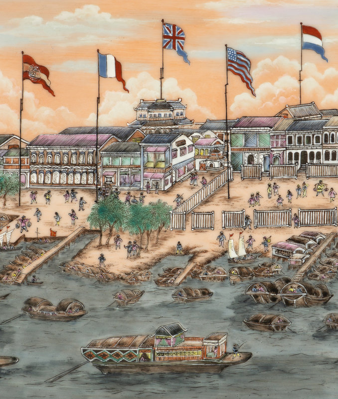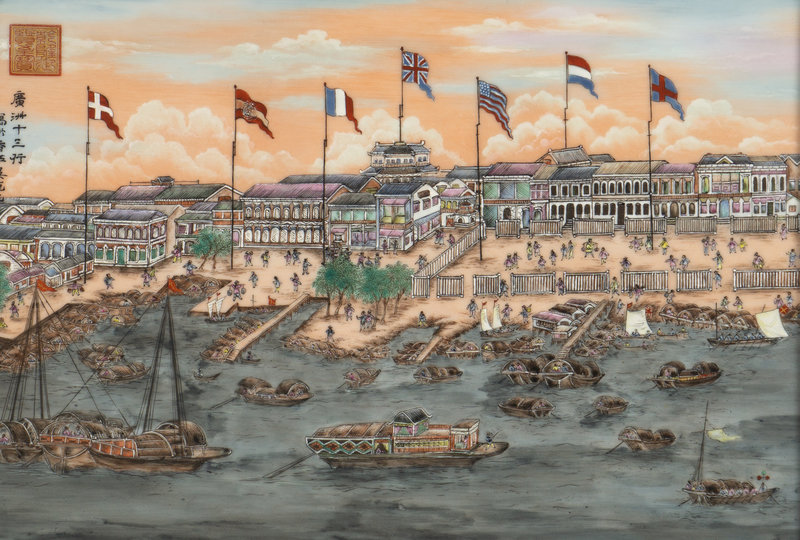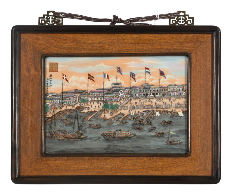 A Chinese Export Painted Plaque Depicting the Quay of Canton