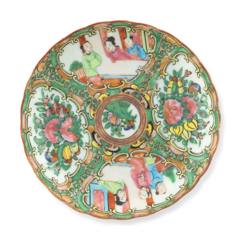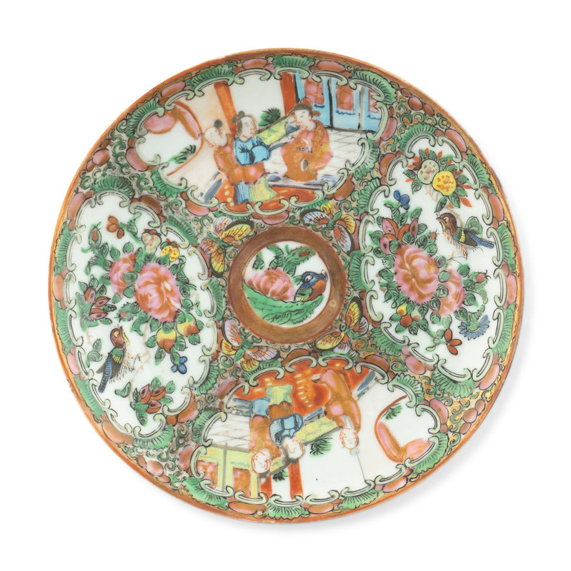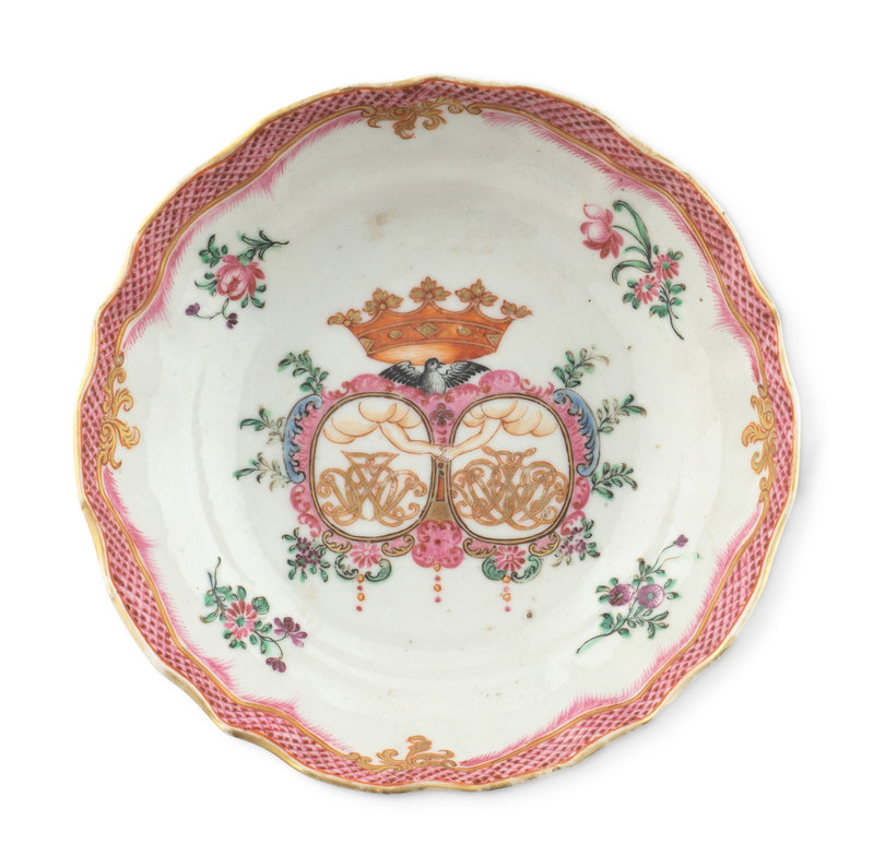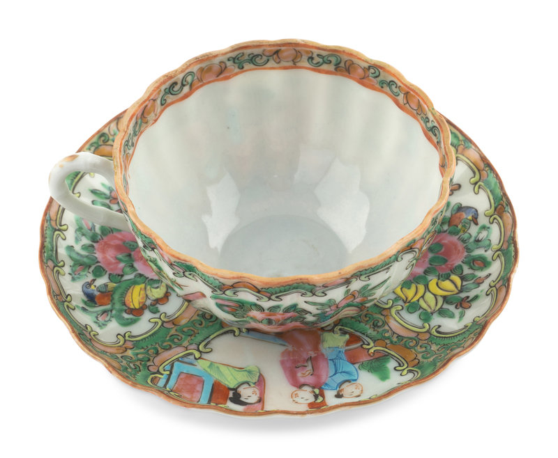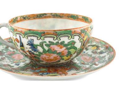 comprising an armorial porcelain cup and saucer dating to circa 1780 and a pair of rose medallion teacups and saucers; 6 items total.