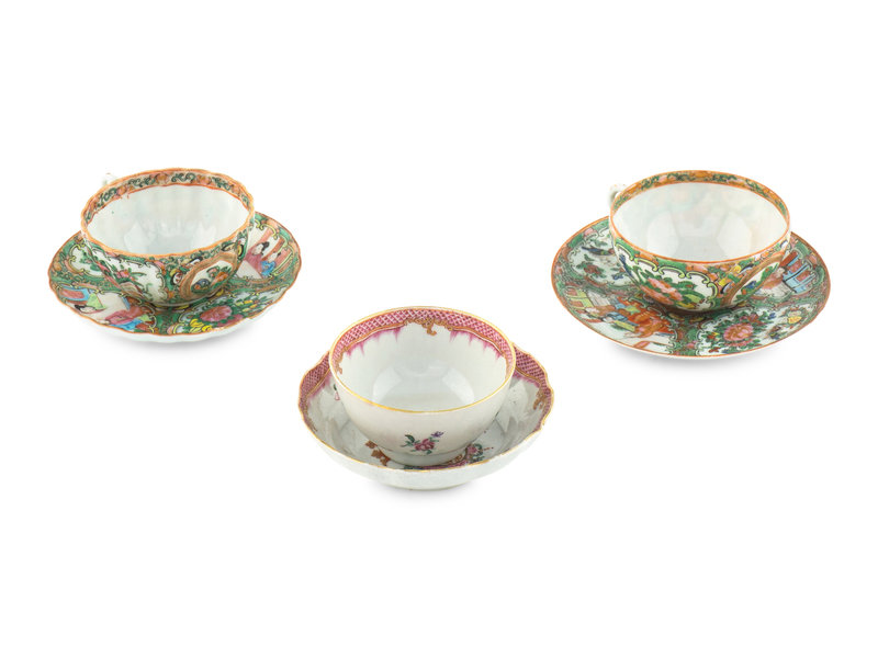 Three Chinese Export Rose Medallion Porcelain Teacups with Saucers