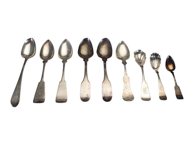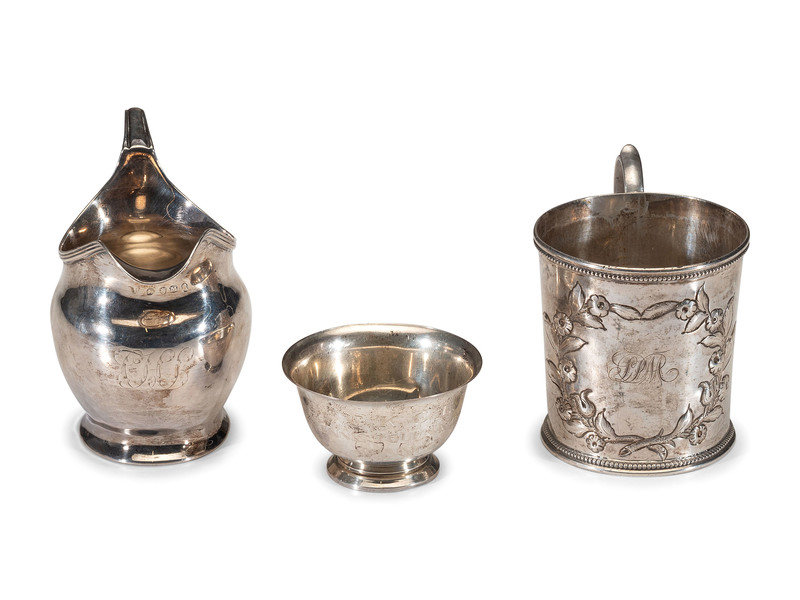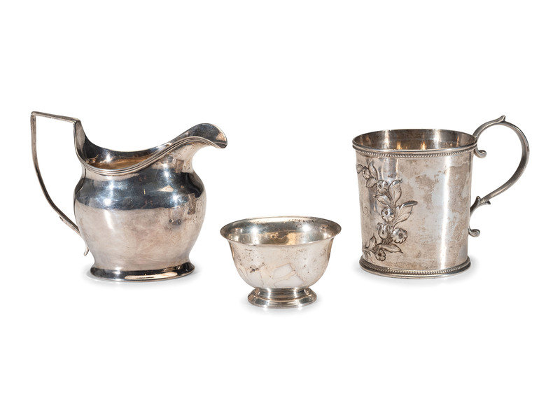 comprising a Georgian cream pitcher and a Tiffany tennis tournament presentation salt, both marked Sterling, and ten coin silver articles by various makers.