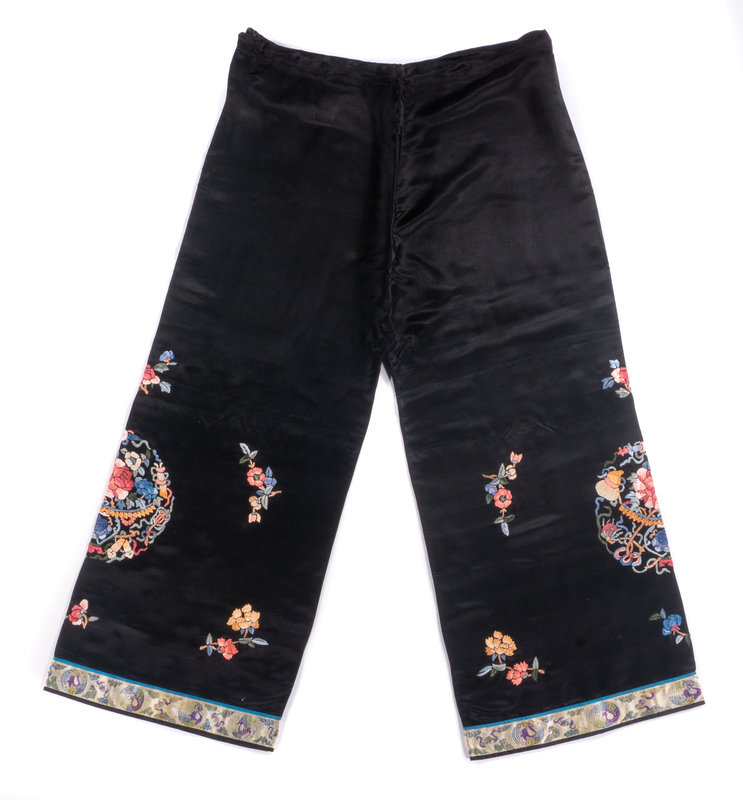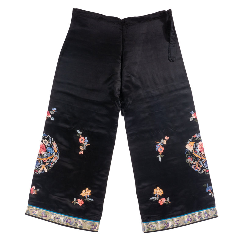 comprising a long jacket and set of wide trousers, each tailored of black satin, embroidered with flowers in polychrome floss, and trimmed in wide ribbons. The jacket having a central toggle closure, the pull-on pants finished with a tie fastener.
