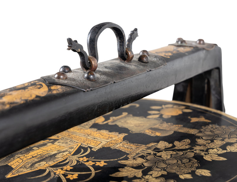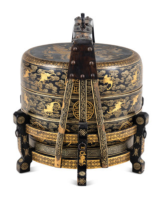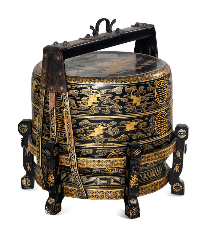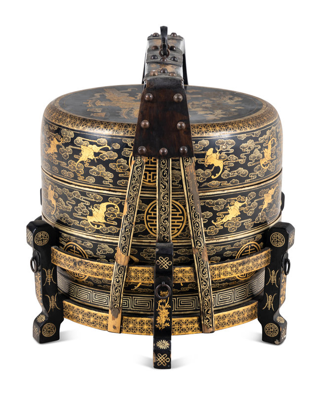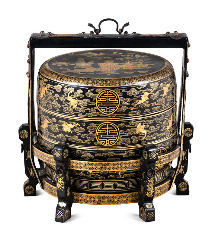 A Chinese Gilt Decorated Black Lacquered Tiered Basket