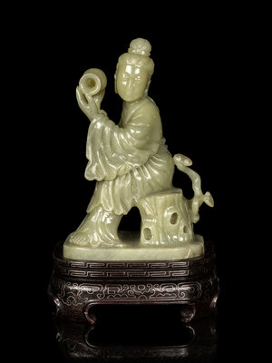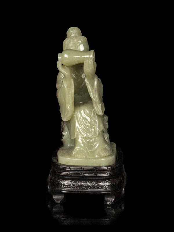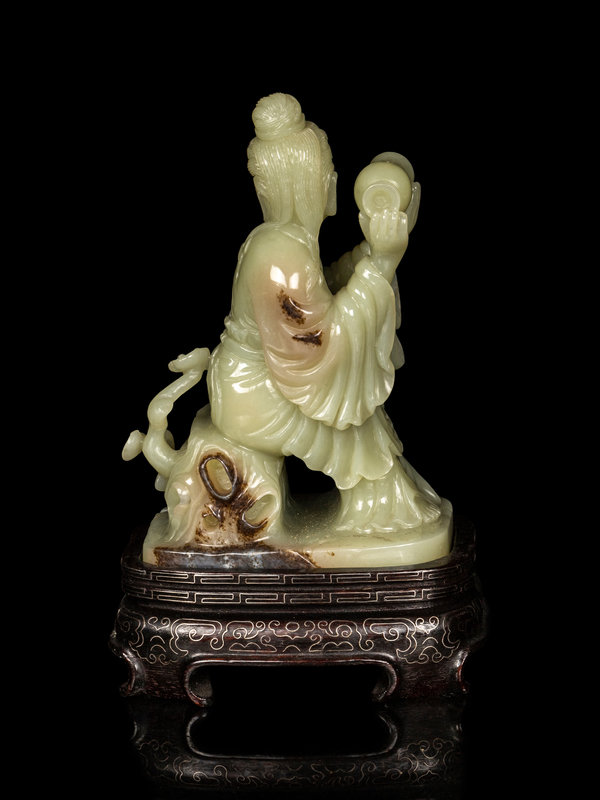 carved to depict a meiren seated on rockery, dressed in voluminous robes with both hands holding a vase as if pouring, raised on a fitted hardwood stand inlaid with silver wires.