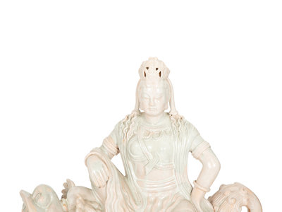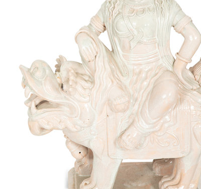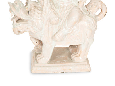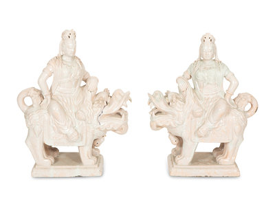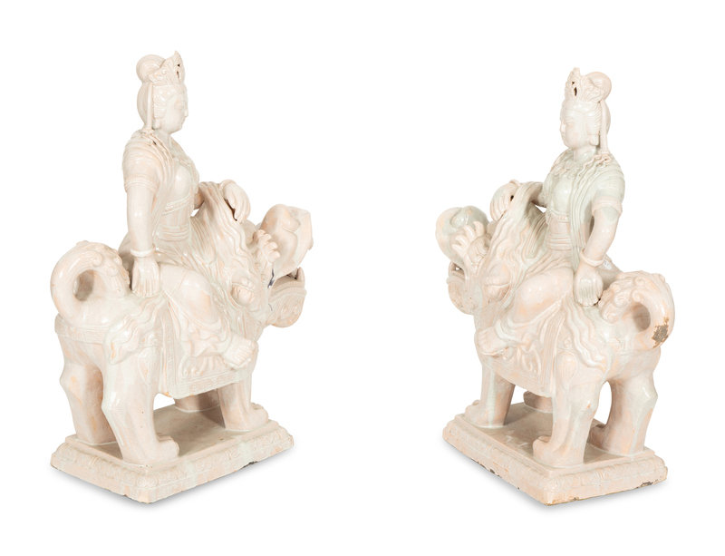 A Pair of Chinese Glazed Ceramic Figures of Guan Yin Atop a Foo Dog