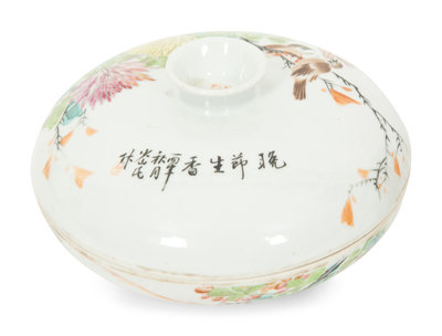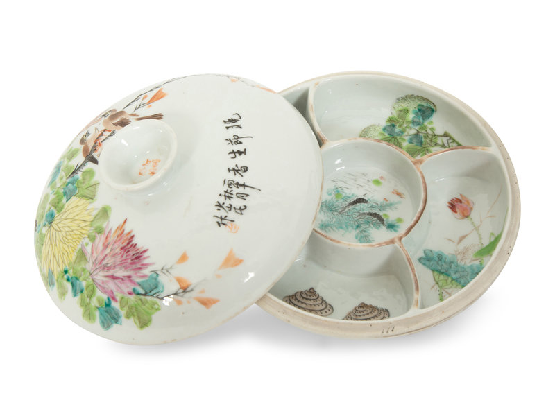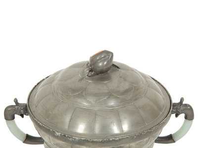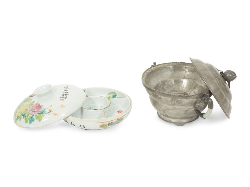 A Chinese Hardstone Mounted Pewter Covered Vessel and a Porcelain Covered Condiment Bowl
