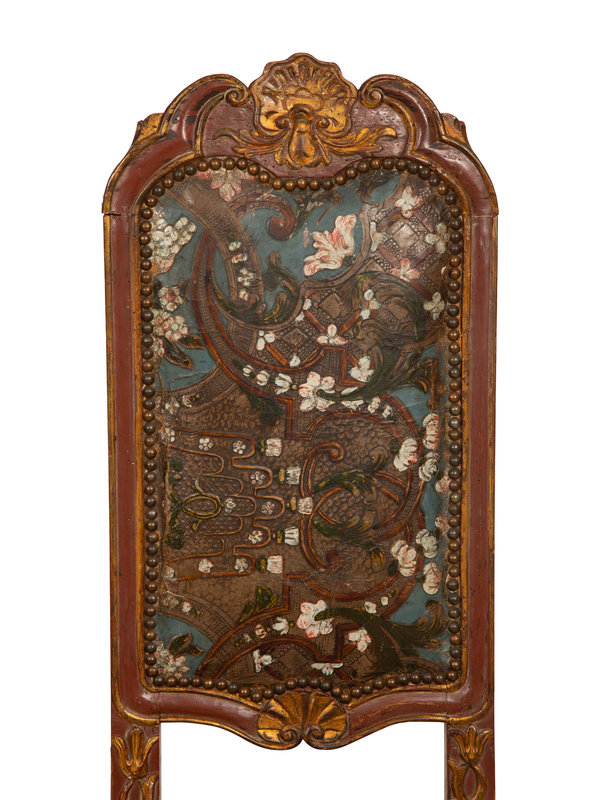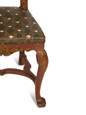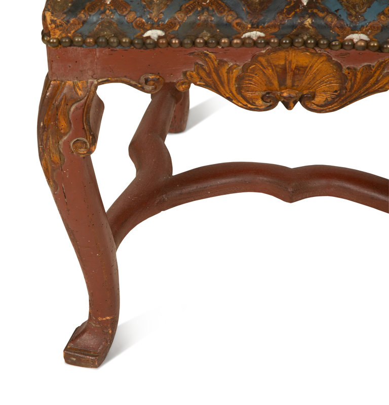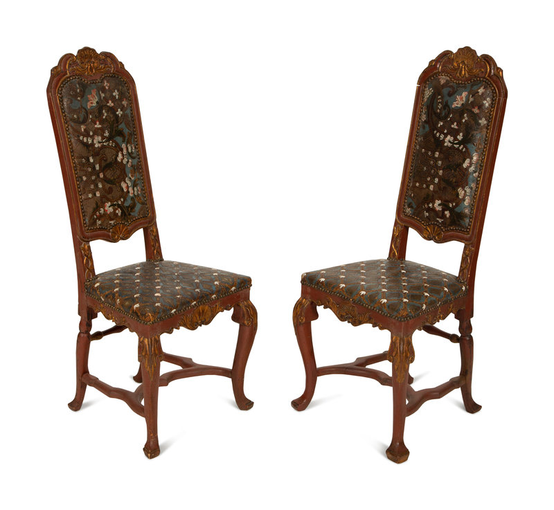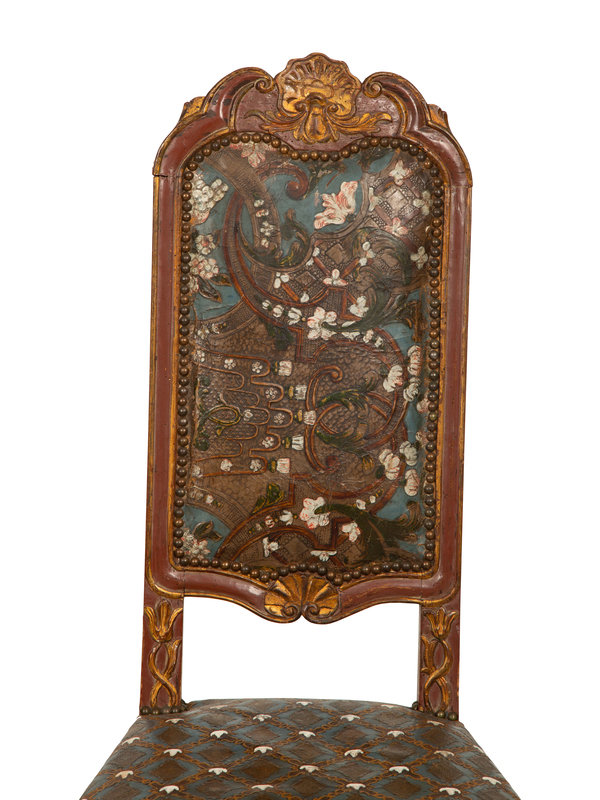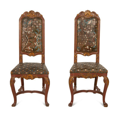 A Pair of Spanish Painted and Parcel Gilt High Back Side Chairs with Painted Leather Upholstery