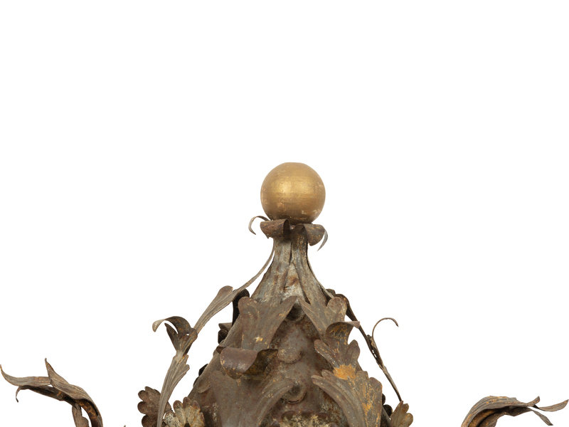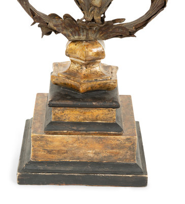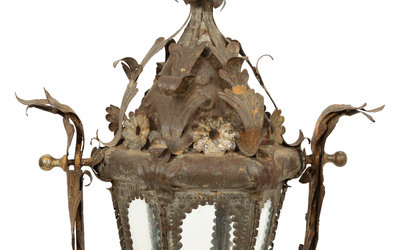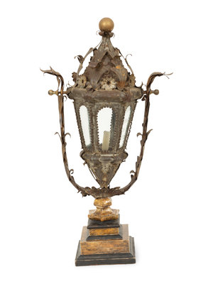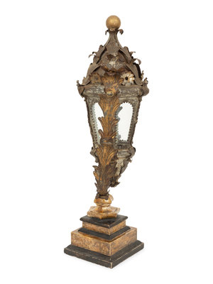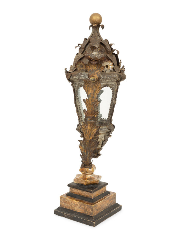 An Italian Tole Swinging Lantern on a Giltwood Stand