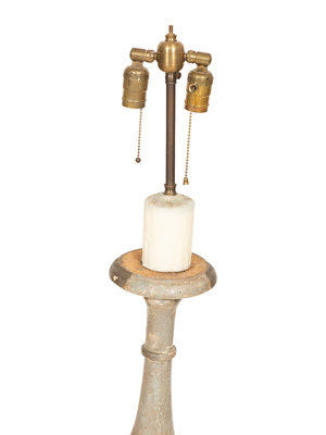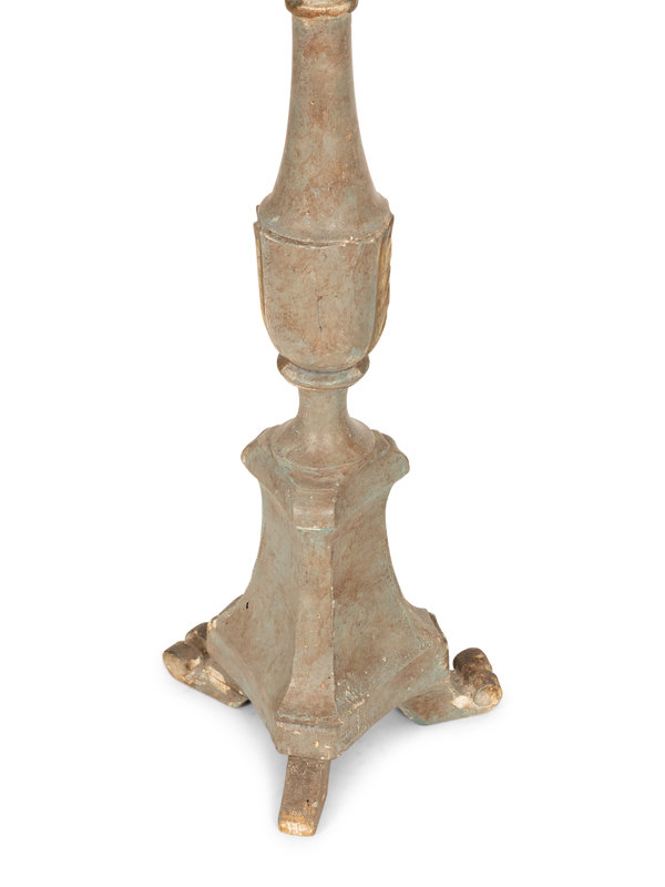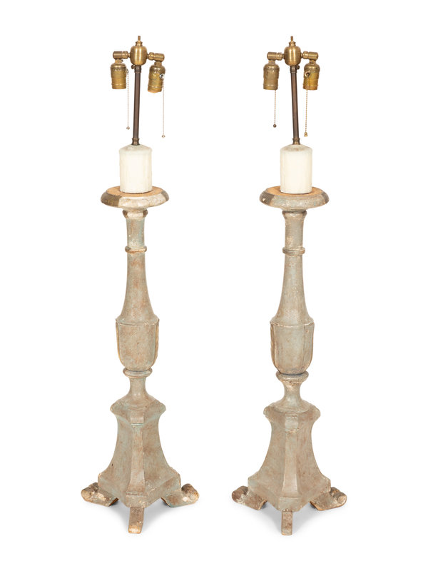 A Pair of Italian Green Painted and Parcel Gilt Pricket Sticks Now Mounted as Lamps