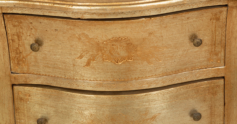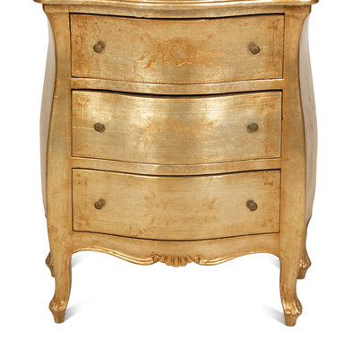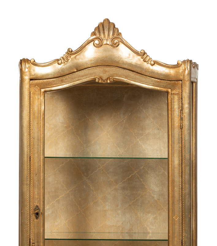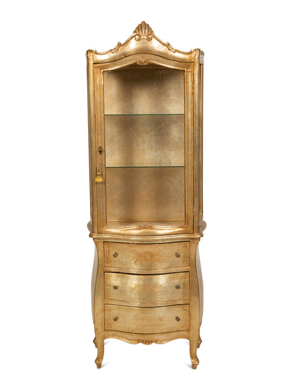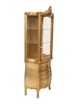 A Silvered Wood Vitrine Cabinet on Three Drawer Bombe Commode Base