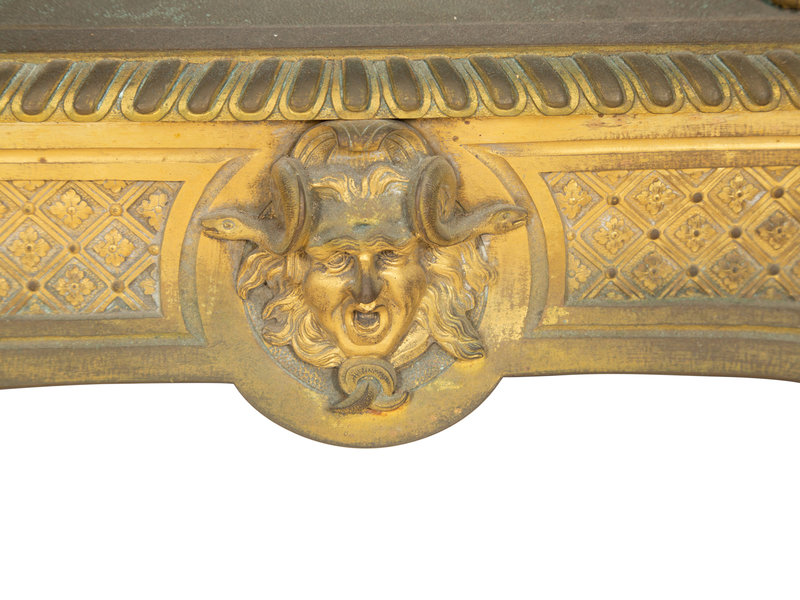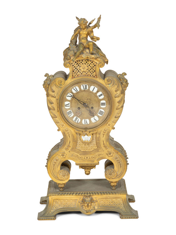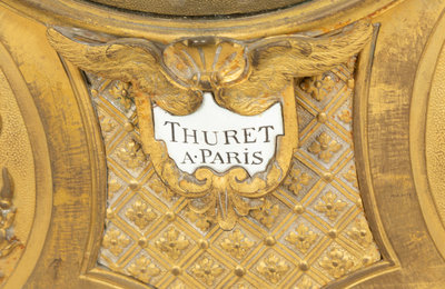 surmounted by winged putto; having an enamel plaque under the dial inscribed Thuret/A. Paris.