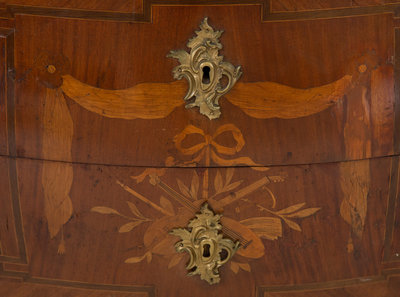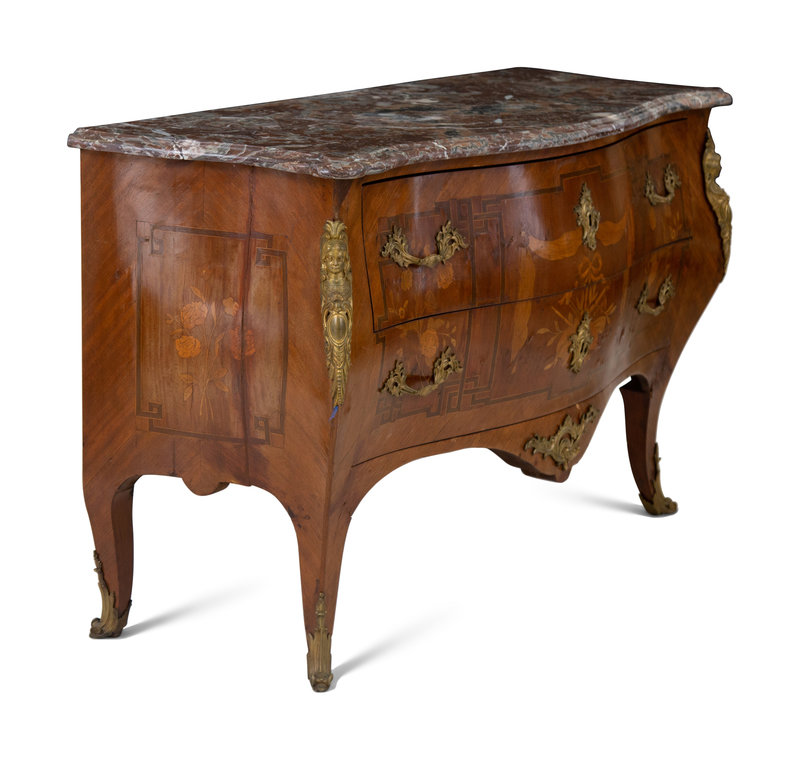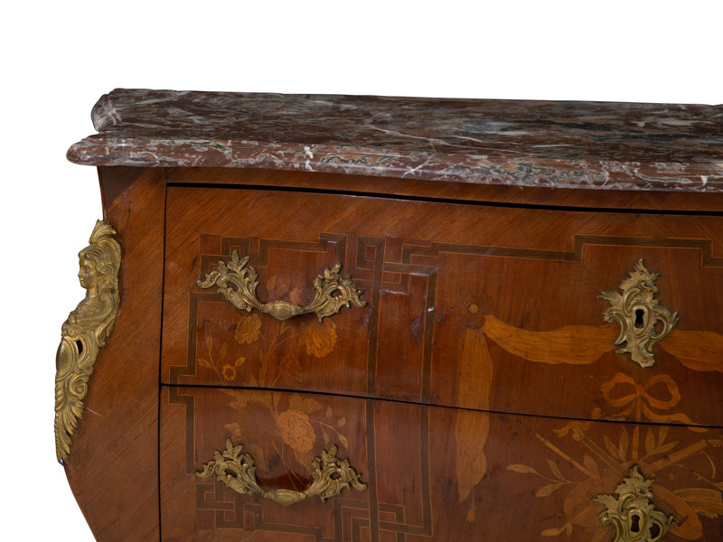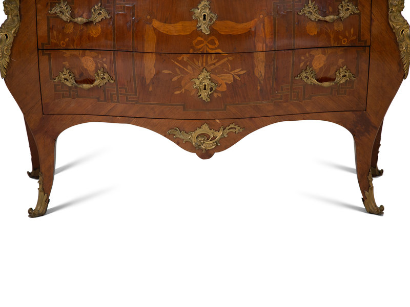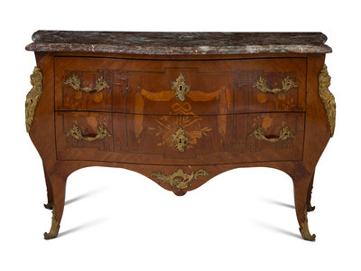 A Louis XV Style Gilt Bronze Mounted Marquetry and Kingwood Marble-Top Bombé Commode