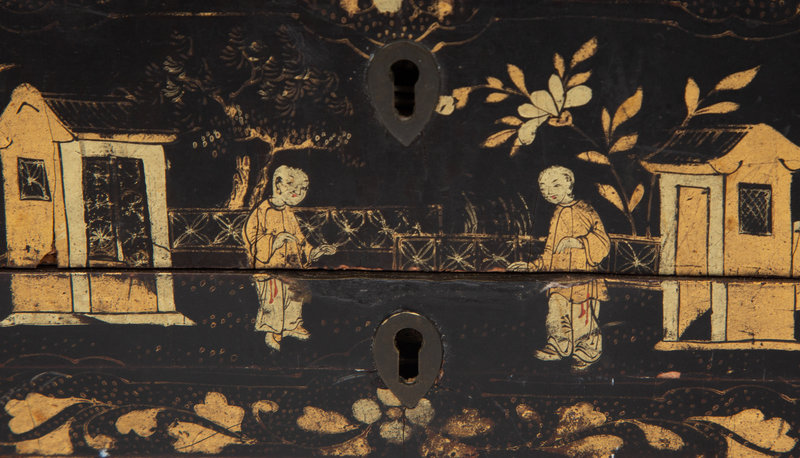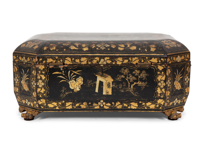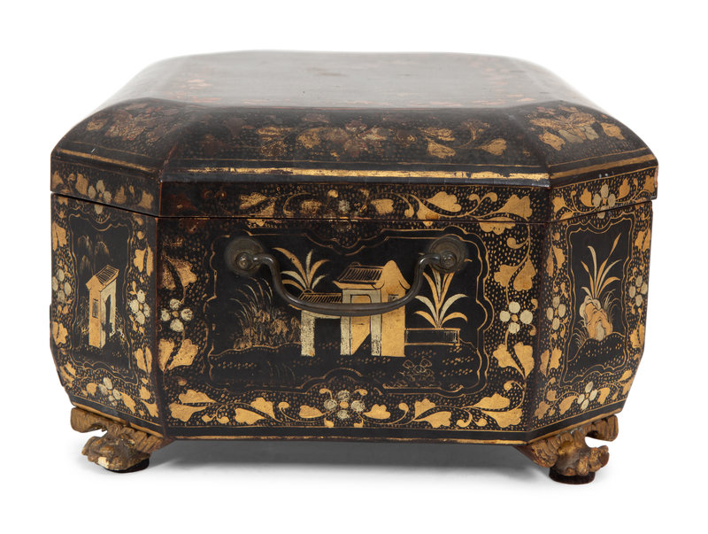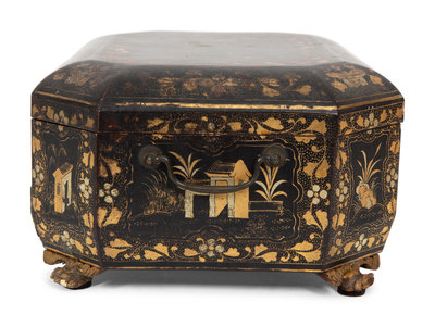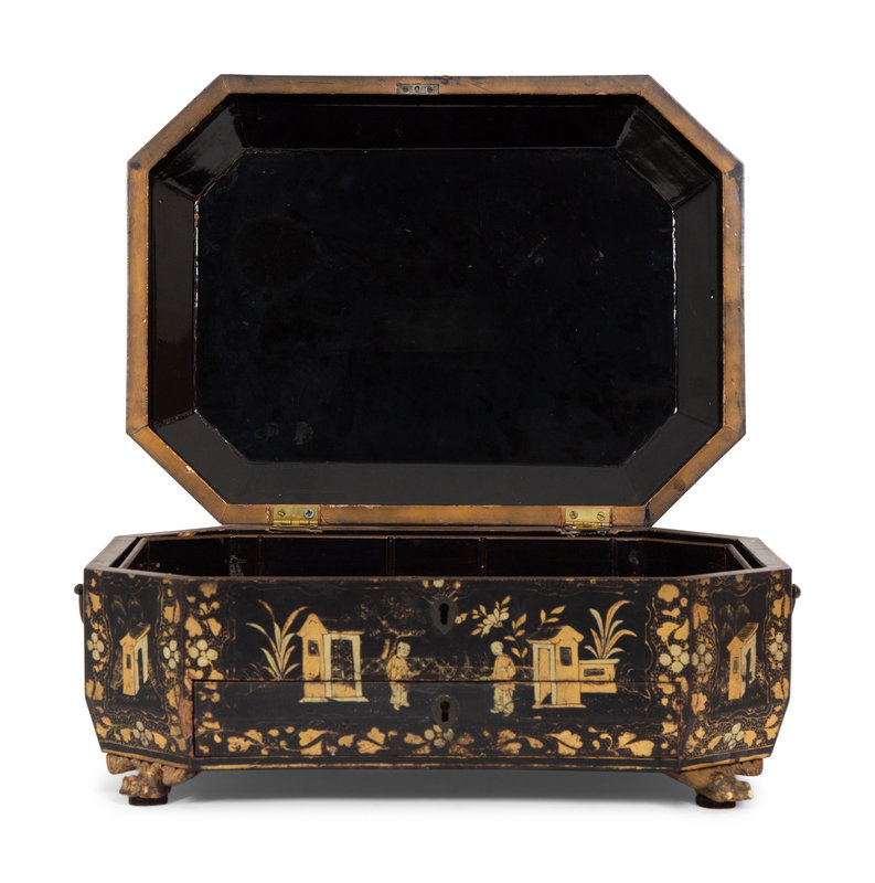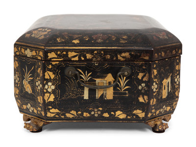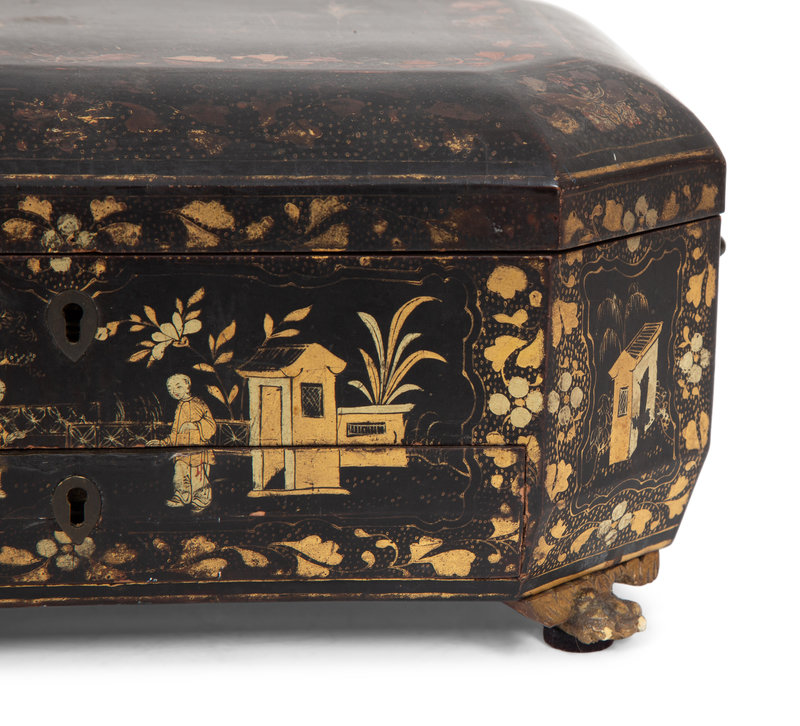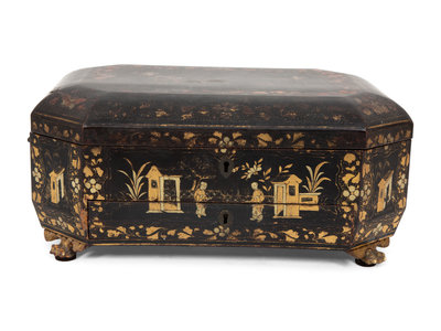 An English Chinoiserie Black and Gilt Lacquer Sewing Box