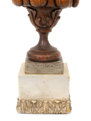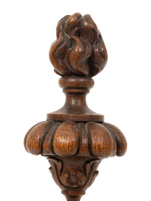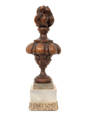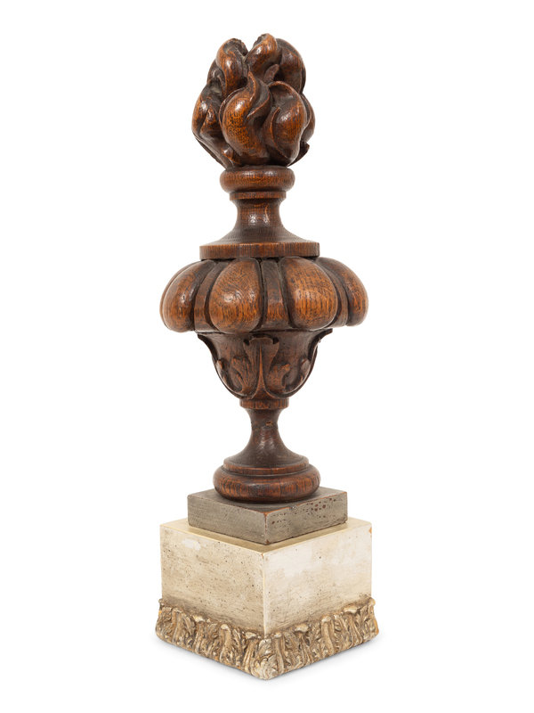 A Carved Oak Flaming Urn Finial Mounted on a Pedestal Base