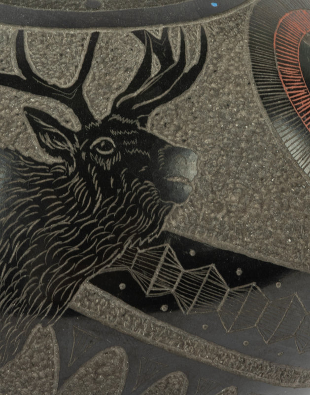 blackware with elk and painted accents; signed on basket; height 4 x diameter 4 inches