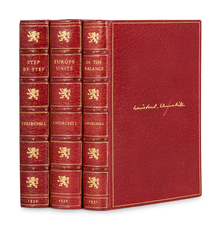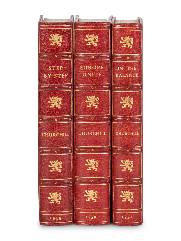 Together, 3 volumes, 8vo. Each with half-title. Uniformly bound in red crushed levant, Churchill's facsimile signature gilt-stamped to upper covers, spines in 6 compartments with 5 raised bands, gilt-lettered in 3, gilt-decorated with lion emblems in 4, edges gilt, stamp-signed by Bayntun.