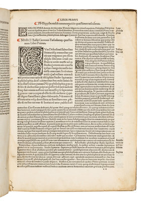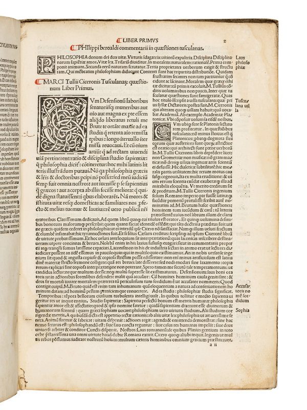 CICERO, Marcus Tullius (106-43 B.C.). Tusculanae disputationes. Commentary by Philippus Beroaldus. Venice: Bartholomaeus de Zanis, 17 July 1499.