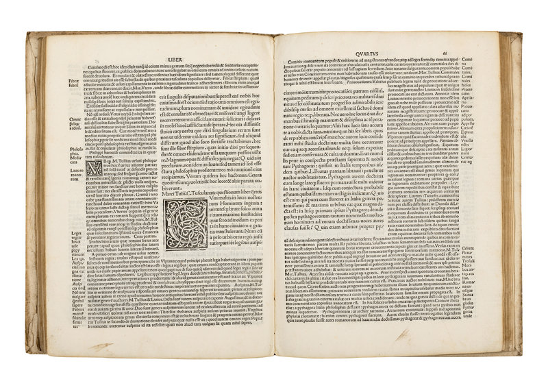 In the Tusculanae, Cicero shows the Roman cultural framework and compares Rome to Greece. The commentary is by Filippo Beroaldo (1453-1505), the Italian humanist and preeminent scholar from Bologna, famous above all as a commentator on Apuleius. Reprinted from the edition of Benedictus Hectoris, 27 July 1496.