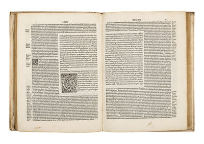 Folio (313 x 218mm). Collation: a-t⁶. 114 leaves. Types 2:80R, 5:106R, and occasional Greek type. 62 lines of commentary surrounding the text, shoulder notes, woodcut capitals. (Some worming to gutter margins at front and lower margins towards end, some intermittent pale dampstaining.) Contemporary (original?) Italian limp pasteboards, manuscript title to spine, remnants of original alum-tawed slit thongs (a little wear to joints at bands, some soiling and staining, text block detached from binding). Provenance: The Divinity School of the Protestant Episcopal Church (bookplate, perforated stamp and accession number on title, perforated stamp on lower margin of f1).