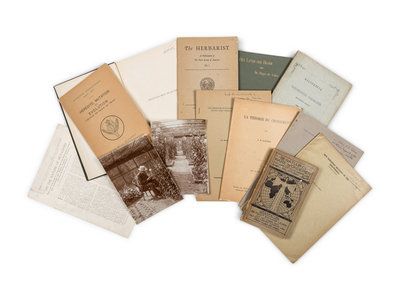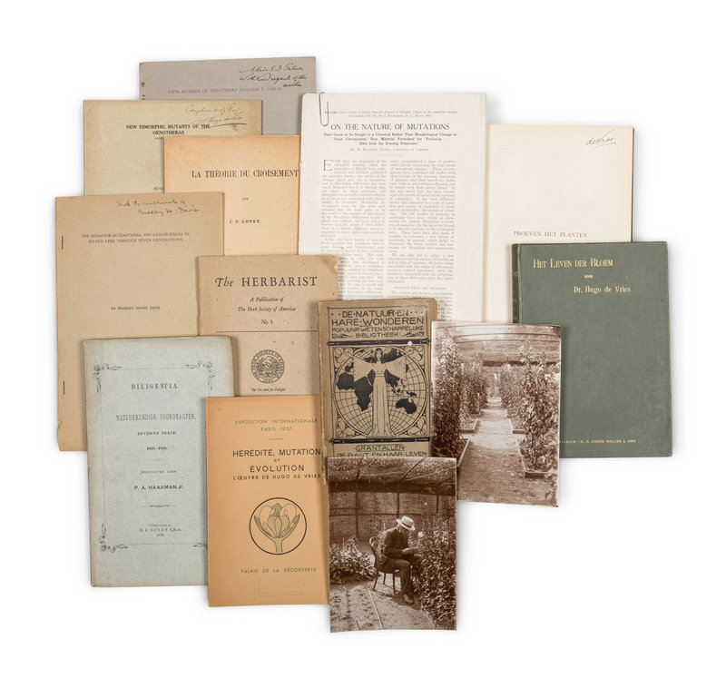 Approximately 1,000 pamphlets, books, and other items by and related to Hugo de Vries (many from his personal library), including many items SIGNED by DeVries and other prominent geneticists such as Bradley Moore Davis, Nils Heribert-Nilsson, and others. Numerous photocopied pages from personal journals, unpublished letters, and other items, as well as carbon copies of correspondence between de Vries and his American personal assistant, Elizabeth Day Palmer, along with modern printings of books by and related to de Vries and other geneticists. Provenance: Hugo de Vries, Elizabeth Day Palmer, Charles Atwood Kofoid, others (ownership inscriptions, bookplates).
