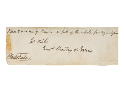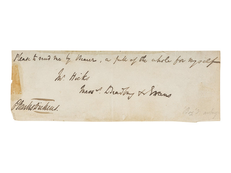 In full: “Please to send me by Bearer, a pull of the whole for myself / Mr. Hicks / Messrs. Bradbury & Evans / Charles Dickens.”