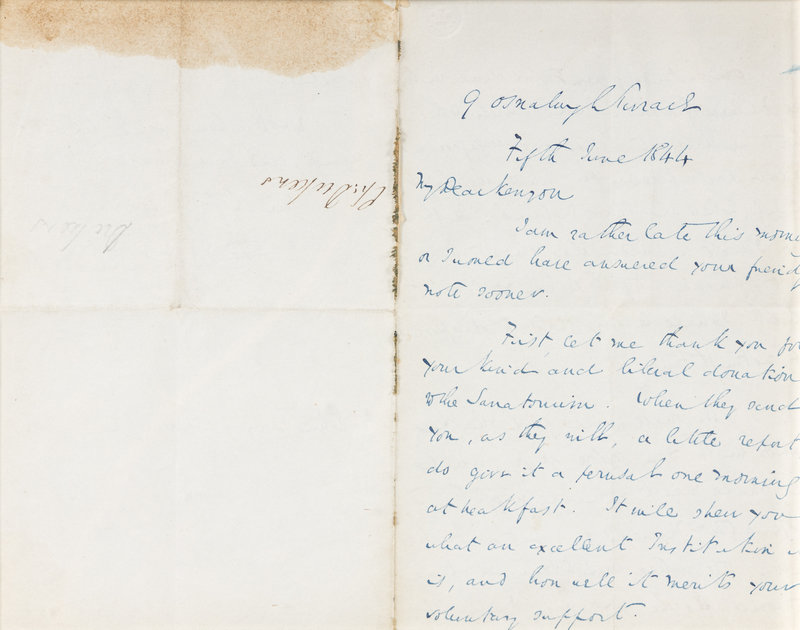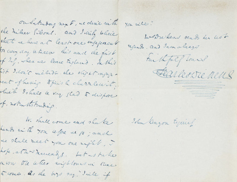 Dickens thanks Kenyon for his “liberal donation” to the Sanatorium, and recommends he read the report he will be receiving which “will show you what an excellent Institution is and how well it merits your voluntary support.” Mentions his upcoming engagements, including dining with the Milner Gibsons, before adding: “In this list I don’t include the slight engagement of having to finish Chuzzlewit; which I shall be very glad to dispose of, notwithstanding.” He concludes hoping they get together before his trip to (…): “We shall come and shake hands with you before we go ; and we shall meet you one night, I hope at Mrs. Macready’s. Let us take a vow to be better neighbours in time to come. As the boys say, ‘I will, if you will.’…”.