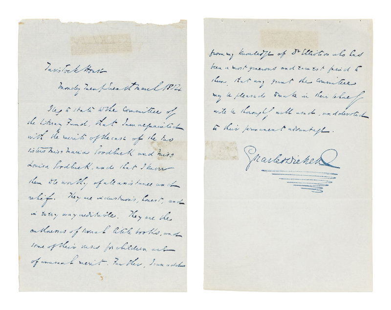 Dickens writes the Committee on behalf of the authors Maria Goodluck and her sister Louisa to receive assistance from the Fund: “…I am acquainted with the merits of the case of the two sisters Miss Maria Goodluck and Miss Louisa Goodluck, and that I know them to be worthy of all assistance and relief… they are the authoresses of several little books, and some of their verses for children are of unusual merit…”. He also mentions his friend “Dr. Elliotson who has been a most generous and earnest friend to them.”