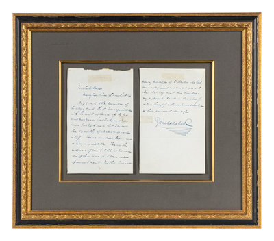2 pages, 8vo, several pale adhesive stains showing through from verso, upper margin edge on first page a little rough. Matted and framed, unexamined out of frame.