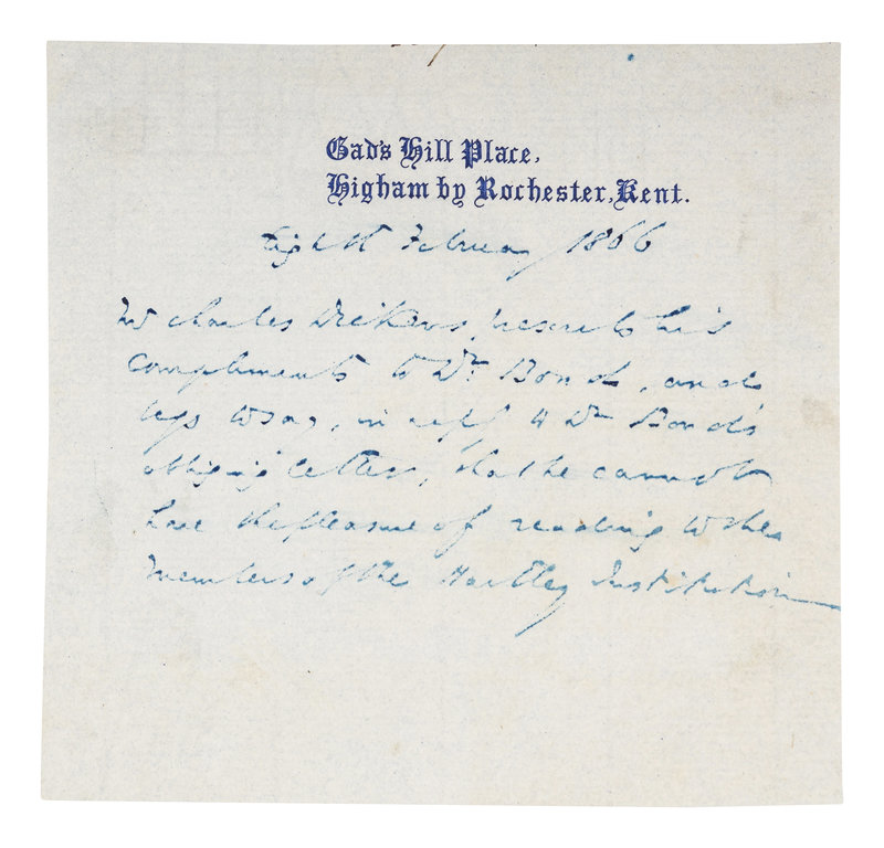 Dickens declines a reading at the Hartley Institution, in full: “Mr. Charles Dickens presents his compliments to Dr. Bond, and begs to say, in reply to Dr. Bond’s obliging letter, that he cannot have the pleasure of reading to the members of the Hartley Institution.”