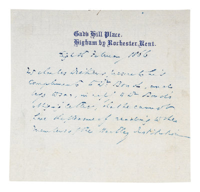 DICKENS, Charles (1812-1870). Autograph note signed in the third person (“Mr. Charles Dickens”), to Dr. Bond, 8 February 1866.