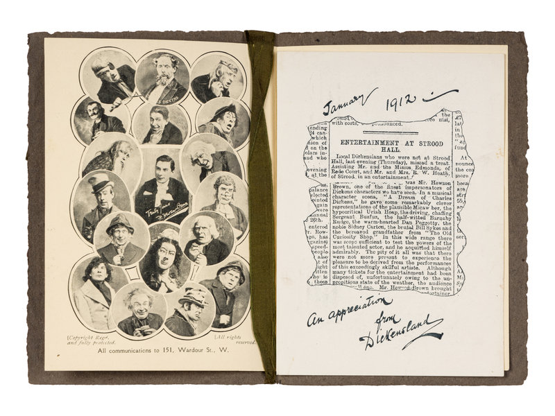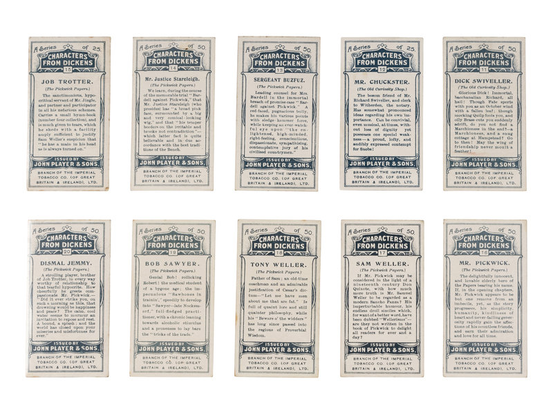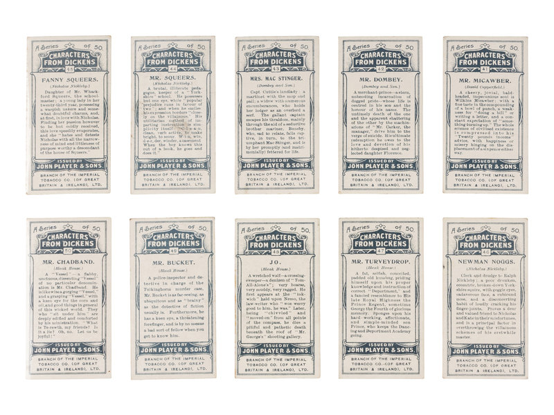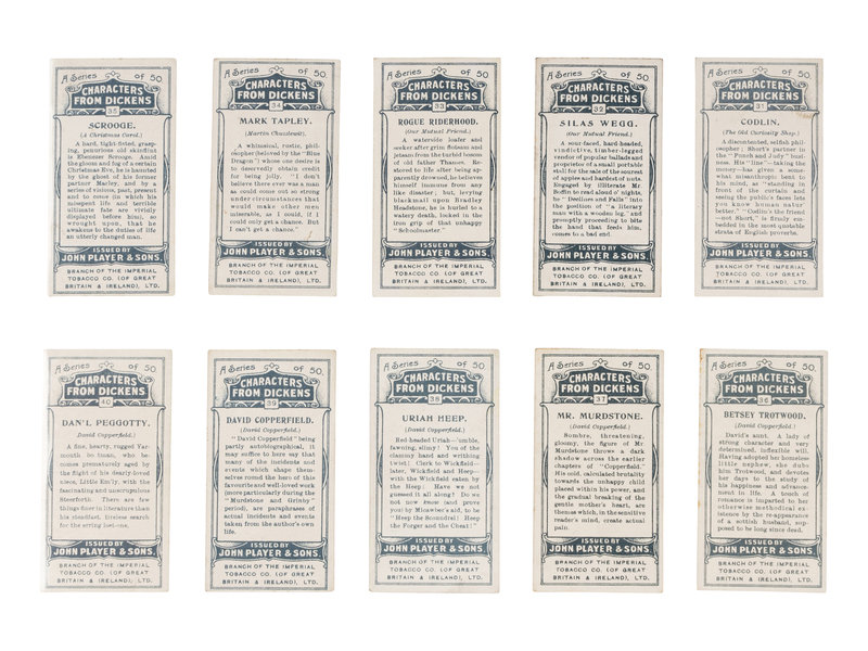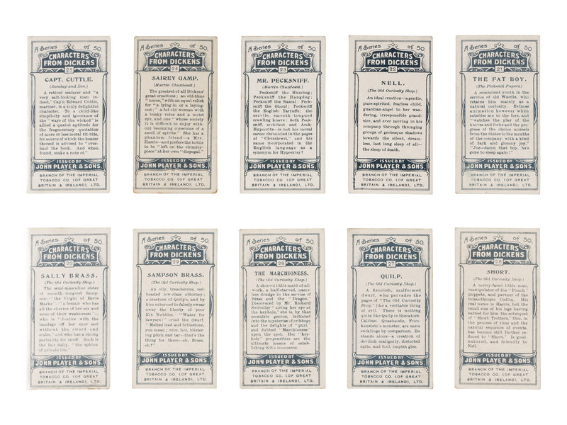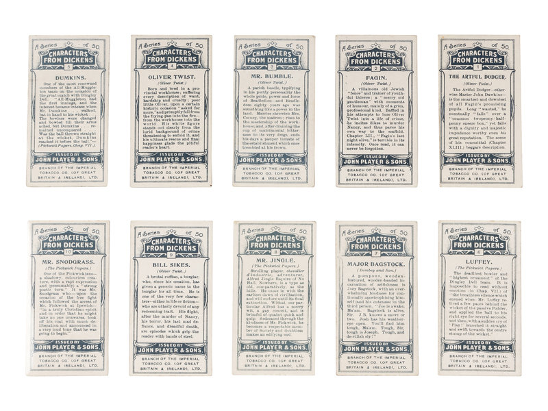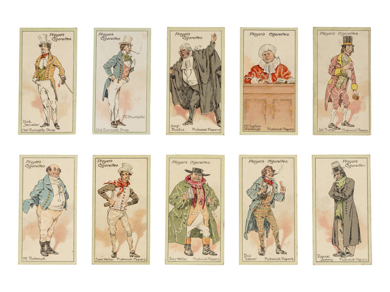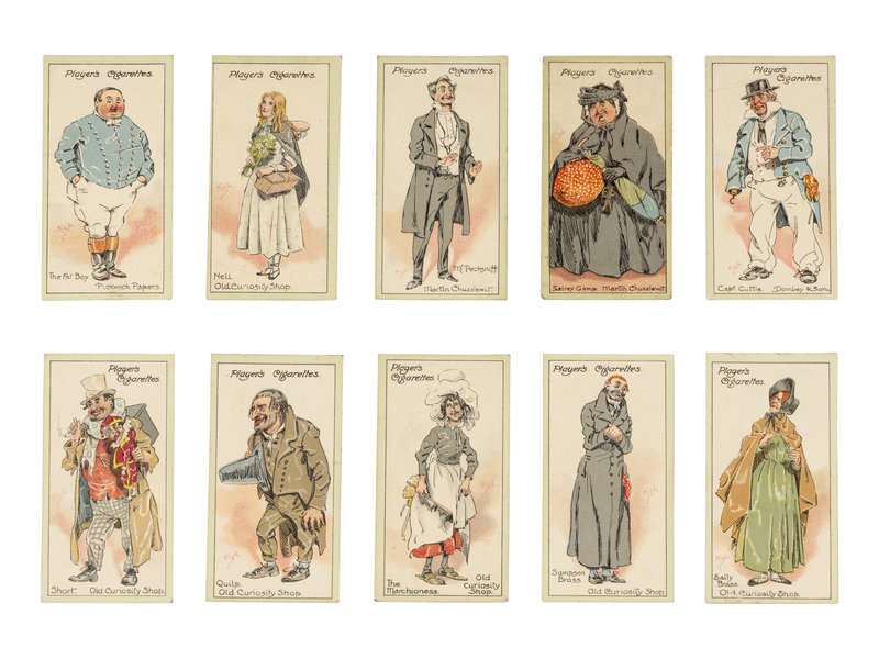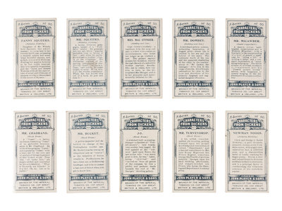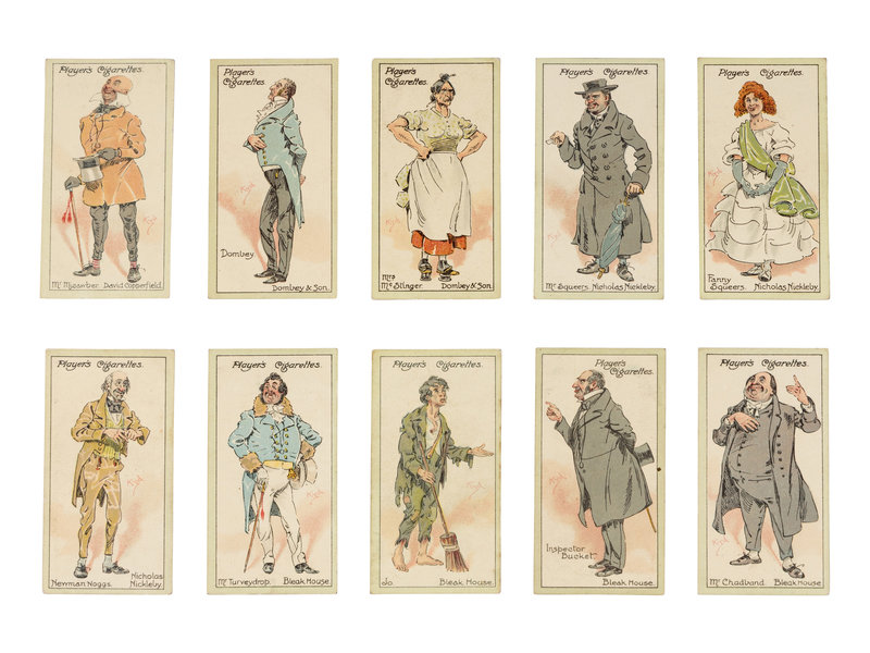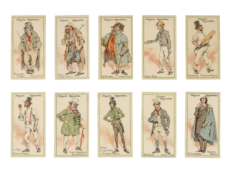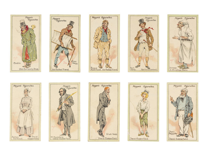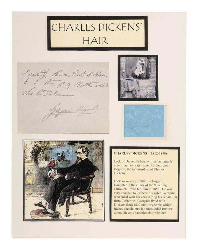 [DICKENS, Charles]. Several strands of hair purportedly from Charles Dickens. Housed in a small plastic sleeve, accompanied by a photocopy of an autograph note of authenticity from Georgina Hogarth, the sister-in-law of Charles Dickens, and a certificate of authenticity from University Archives. — CIGARETTE CARDS. “Characters from Dickens,” a complete set of 50 standard size cigarette cards issued by the John Player Tobacco Co., ca 1923, depicting some of the most notable characters from his fiction, including The Artful Dodger, Fagin, Mr.Bumble, Oliver Twist, Bill Sikes, Mr. Chuckster, Sergeant Buzfuz, Mr.Justice Stareleigh, Mr. Pickwick, Sam Weller, Tony Weller, Bob Sawyer, Nell, Capt. Cuttle, Quilp, Sampson Brass, Rogue Riderhood, Scrooge, Uriah Heep, David Copperfield, Mr. Micawber, Mr. Chadband and numerous others. This set of cards was voted the set of the 20th Century by the members of the Cartophilic Society. — HEWSON-BROWN, H. “A Dream of Charles Dickens.” [London, ca 1910]. 8vo, original printed wrappers, ribbon-bound. A promotional brochure for entertainment by impersonator of Dickens characters, H. Hewson Brown.