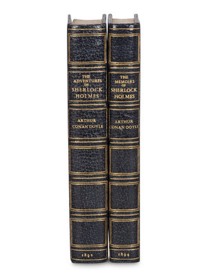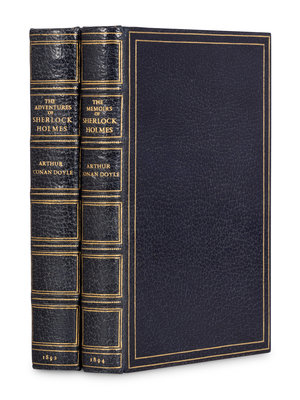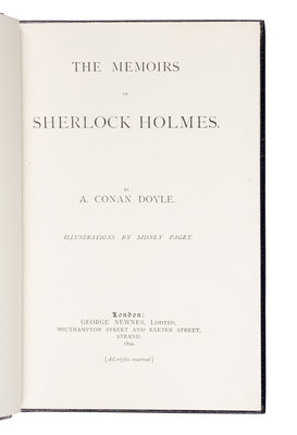 [Uniformly bound with:] DOYLE. The Memoirs of Sherlock Holmes. London: George Newnes, 1894. Small 4to. Numerous illustrations in text by Sidney Paget. (Lacking frontispiece.) FIRST EDITION IN BOOK FORM.