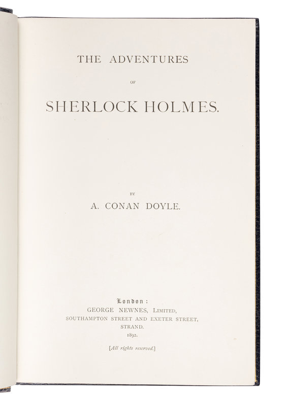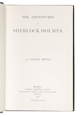FIRST EDITION IN BOOK FORM, FIRST ISSUE of the text, with the misprint Miss "Violent" Hunter for "Violet" in the final sentence of "The Copper Beeches" (p.317). The Adventures of Sherlock Holmes, the first collection of Holmes stories to be published, was released shortly after the success of the series in the Strand Magazine.
