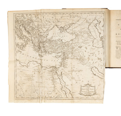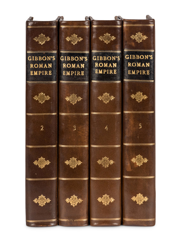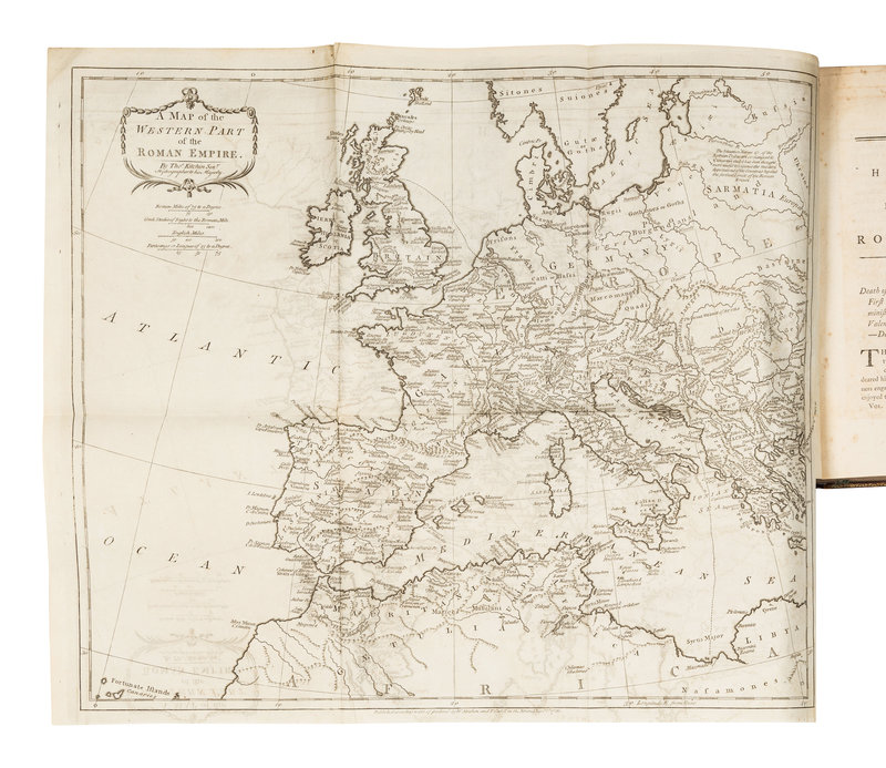 4 volumes (of 6, comprising vols. 2-5), 4to (216 x 267 mm). Vol II: Half title, full-sheet folding map of the Eastern Roman Empire by Thomas Kitchin dated January 1, 1781 bound before p. 1, half sheet map of Constantinople bound before p. 23 (some minor offsetting to both, a few leaves with light to minor spotting); Vol III: Half title, full-sheet folding map of the Western Roman Empire by Thomas Kitchin dated January 1, 1781 bound before p.1 (some minor offsetting); Vol IV: Half-title; Vol V: Half title. Later calf gilt with original calf pasted over (rubbing, toning to edges of endpapers). Provenance: Hugh Fortescue, 1st Earl Fortescue (bookplates).