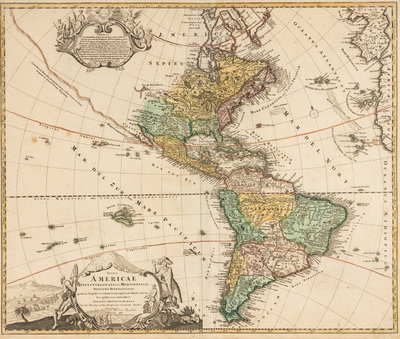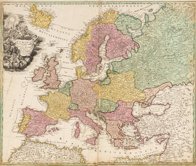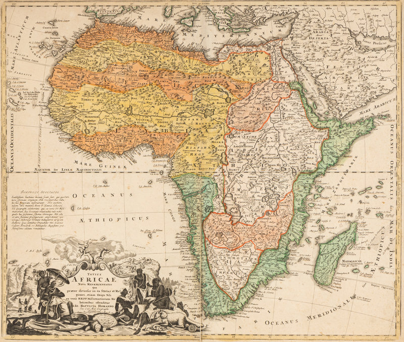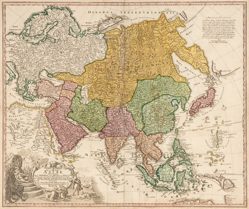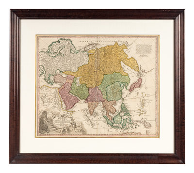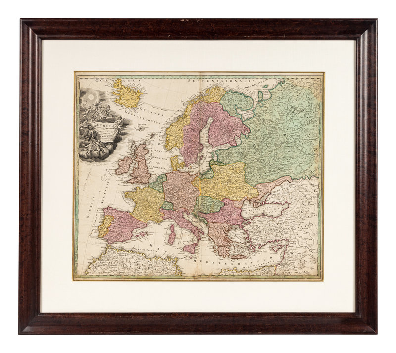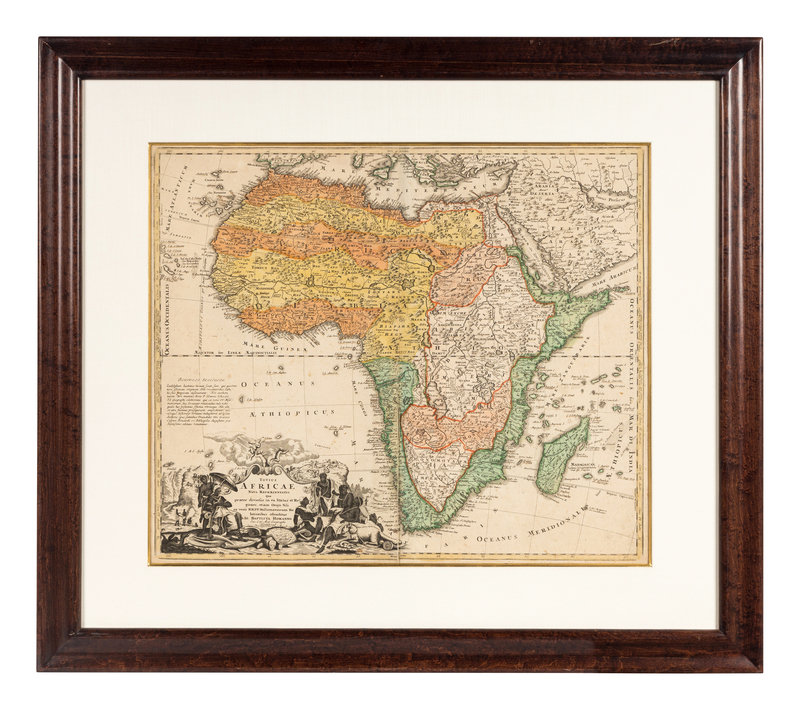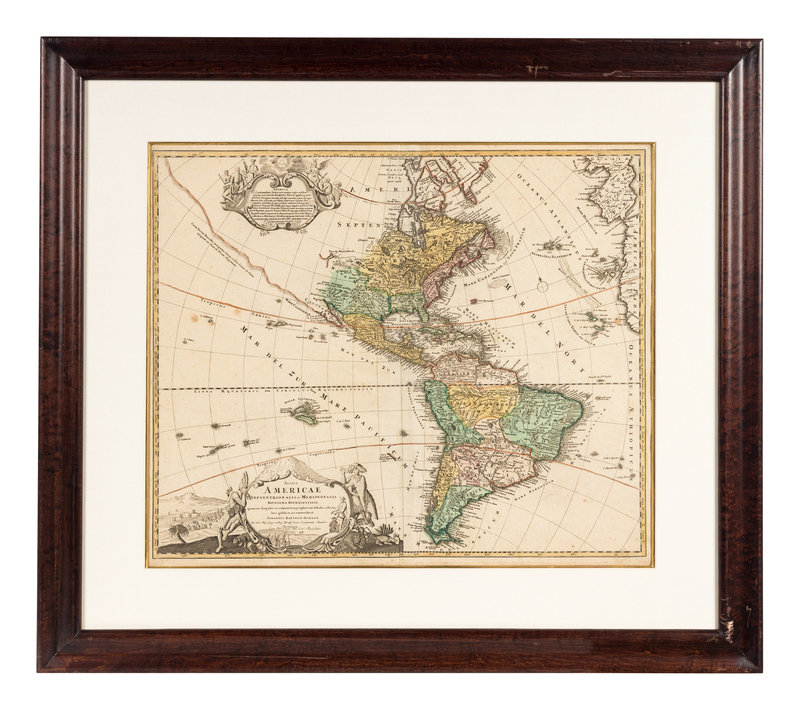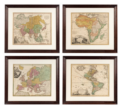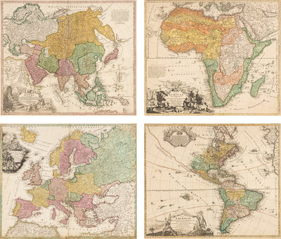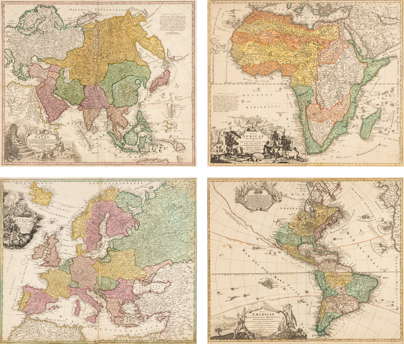 Totius Americae… Nuremberg, [ca 1720]. Overall sheet 508 x 590 mm. -- Europa… Nuremberg, [ca 1720]. Overall sheet 505 x 598 mm). -- Recentissima Asiae… Nuremberg, [ca 1720]. Overall sheet 506 x 590 mm. -- Totius Africae… Nuremberg, [ca 1720]. Overall sheet 507 x 590 mm. (7 3/4-in. separation along centerfold repaired verso.) Matted and framed. – Together, 4 maps, some minor soiling, a few mostly marginal tears occasionally repaired.