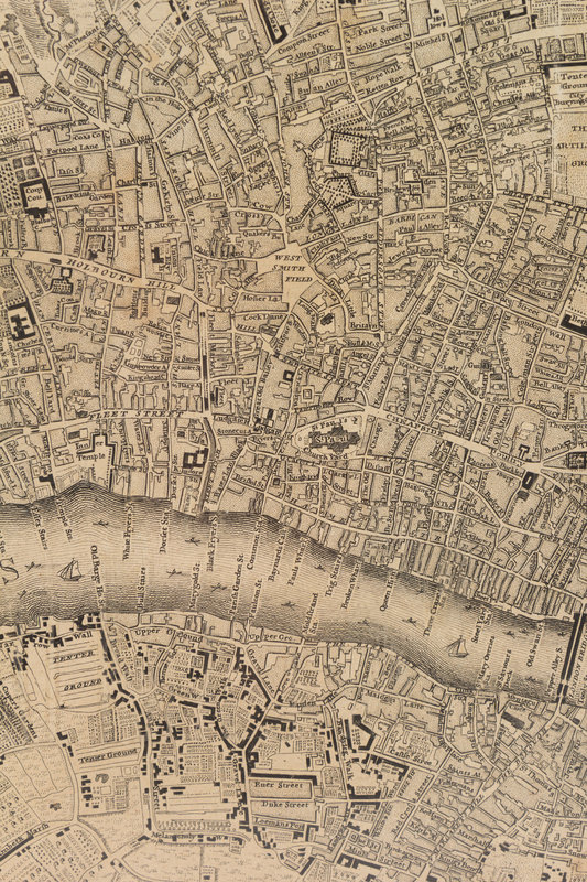 Engraved map of Central London, including the River Thames, St. James’s Park, Totthill Fields, St. George’s Fields, Lambs Conduit Fields, Tottenham Court, Hoxton, Bethnal Green, Islington, King Island, Hoxton, and Hackney. (Some browning and soiling, a few short mostly marginal tears.) Overall sheet 546 x 710 mm.