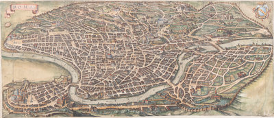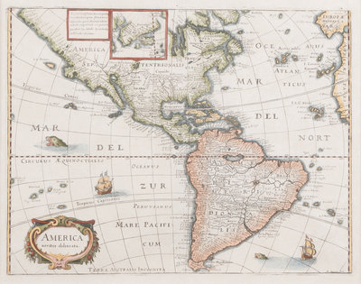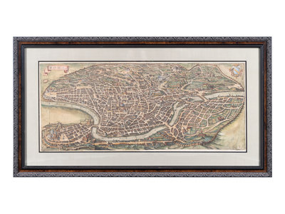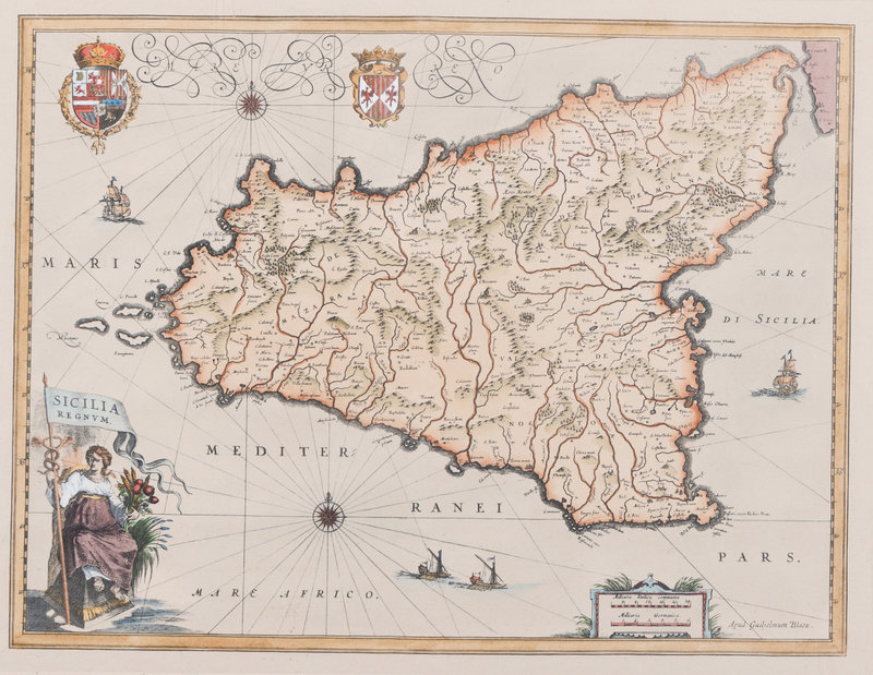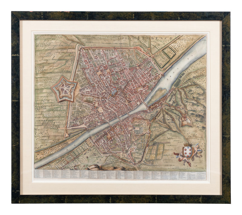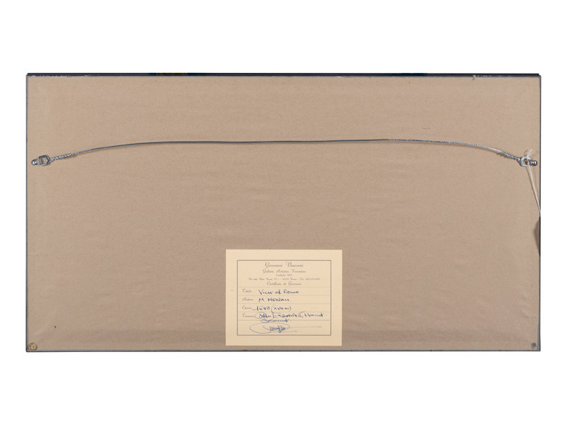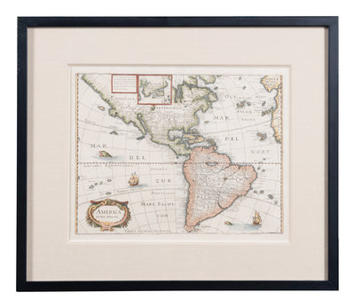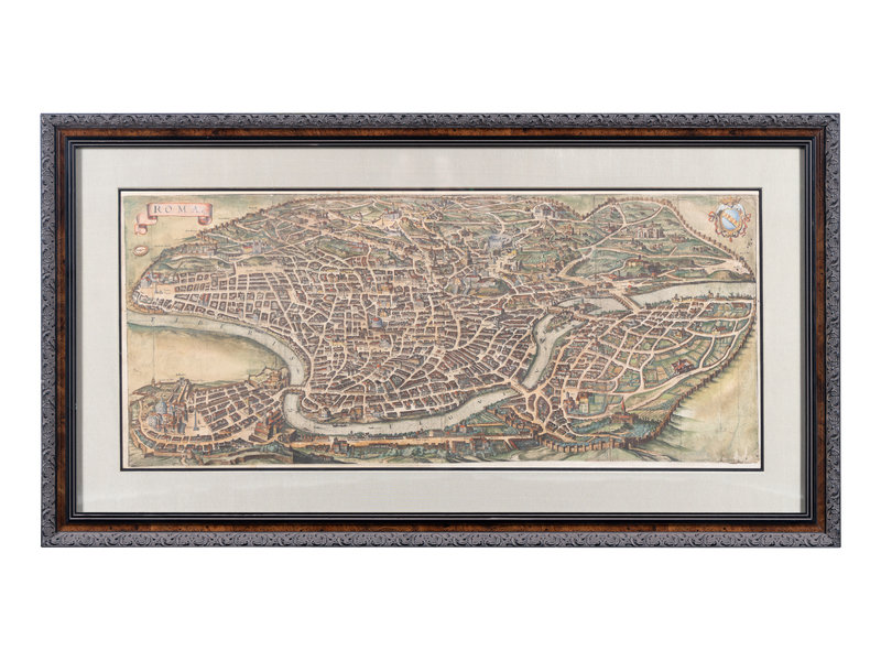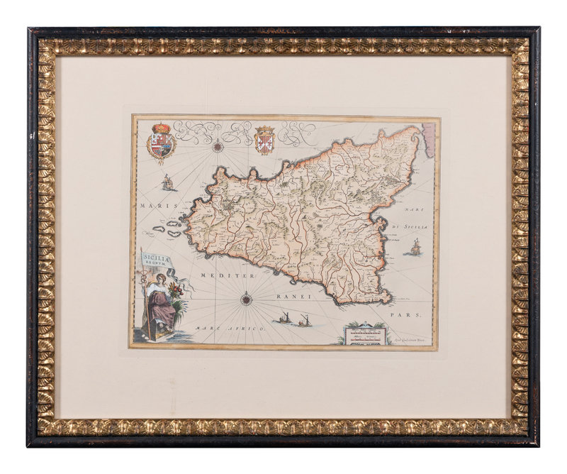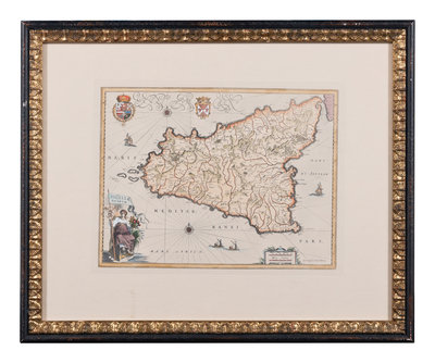 MERIAN, Matthäus. America noviter delineata. Ca 1740. Visible area 298 x 375 mm. Burden 251. -- MERIAN, Matthäus. Roma. Ca 1642. Visibale area 310 x 709 mm. -- MORTIER, Pieter. La ville de Florence, Amersterdam. Ca 1704. Visible area 505 x 600 mm. -- BLAEU, Willem Janszoon. Sicilia Regnum. 20th-century reproduction. Visible area 465 x 582 mm. -- Together, 4 maps, each matted and framed (unexamined out of frame).