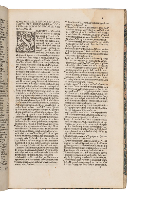 NONIUS, Marcellus. De Proprietate Sermonum -FESTUS, Sextus Pompeius. De verborum significatione. -VARRO, Marcus Terentius. De lingua latina. Edited by Pomponius Laetus and Franciscus Rolandellus. Venice, Philippus Pincius, 17 May, 1496.