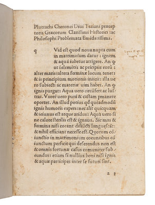 PLUTARCH (ca 46-ca120). Problemata. Translated by Joannes Petri Lucensis. Edited by Joannes Calphurnius. [Ferrara?: Andreas Belfortis, Gallus, ca 1477?].