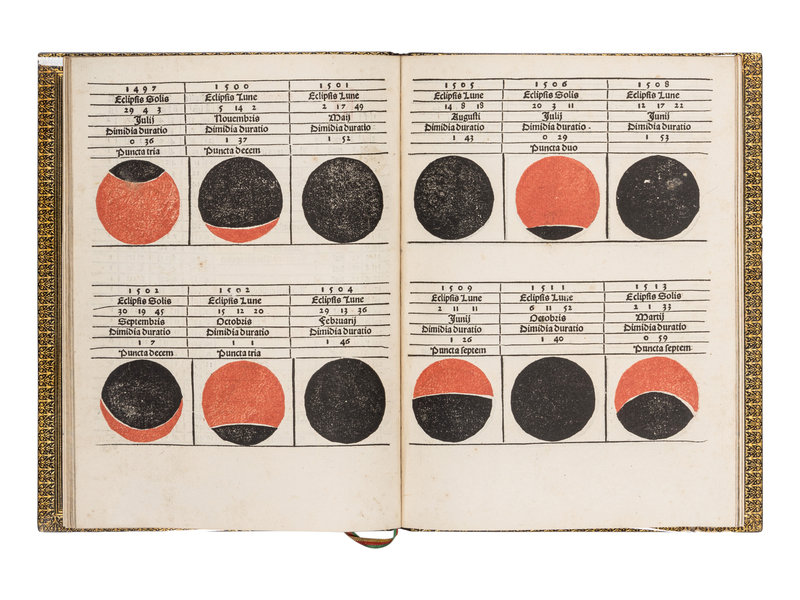 4to (189 x 140 mm). 25 (of 30) leaves. Printed in red and black, woodcut illustrations of eclipses of the sun and moon printed in red and black. Gothic type. (Lacking the final 5 leaves: c8 [blank] and quire d). Late 19th-century morocco.