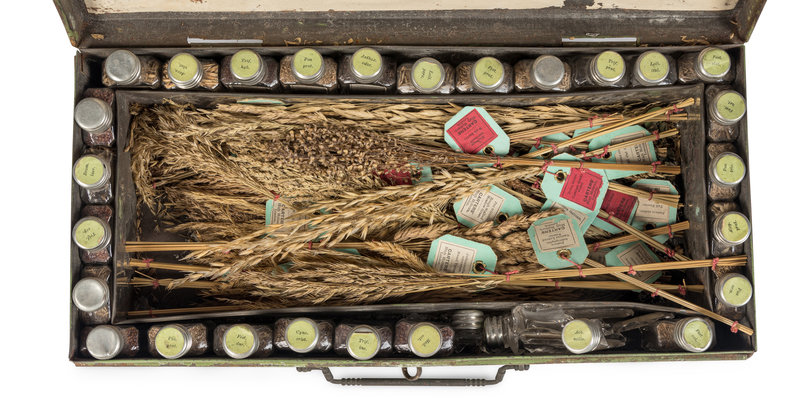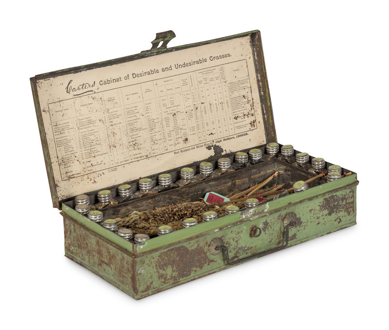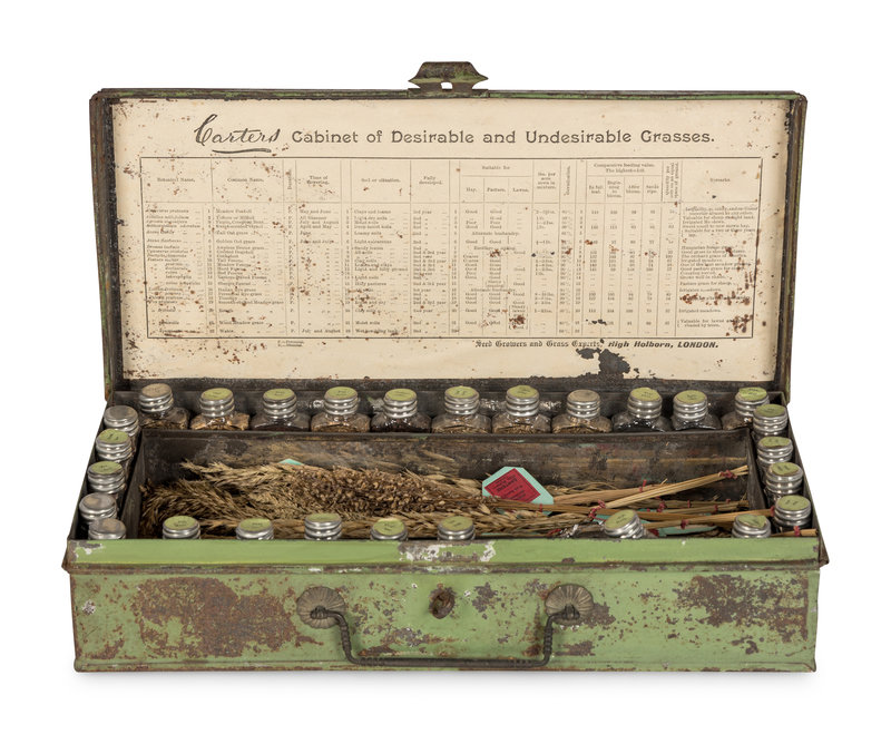 Rare "Cabinet of Desirable and Undesirable Grasses" containing samples of grasses used in agriculture, as animal feed or for the lawns of ornamental and public gardens, and including samples that are not of economic value or interest. The earliest reference for Carters Tested Seeds Ltd. firm is in an 1804 London directory. They moved their premises to Raynes Park in 1910-1911, where they operated until 1970. In the 1880s, they counted the Queen of England, the Prince of Wales, the Sultan of Turkey the King of Portugal, and the King of Italy among their patrons.