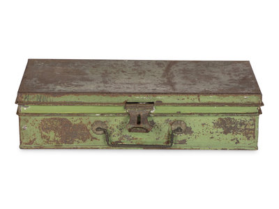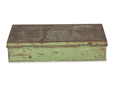 Original green metal box housing 26 glass bottles holding seed samples (of 29, three bottles broken), each with printed labels on one side and on lid, inserted in a narrow channel surrounding the perimeter of the box. Approximately 35 dried intact mature grass specimens, each tied and with a printed tag. Printed label on inside of box lid.