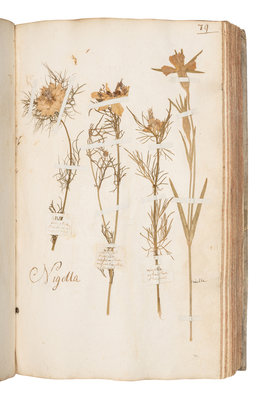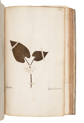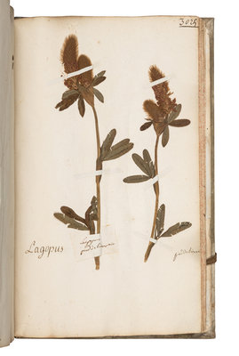 2 volumes, folio (318 x 205 mm). Album of approximately 321 plant specimens with manuscript captions and occasional manuscript notes in lower margin. Manuscript indices in each volume (the index for vol. II incomplete), foliated throughout; approximately 329 leaves captioned with no specimens. (Marginal losses to a few leaves, some light soiling, minor dampstaining to a few leaves, a few worm tracks). Contemporary vellum, cloth ties (covers bowed, lacking a few ties).