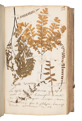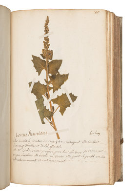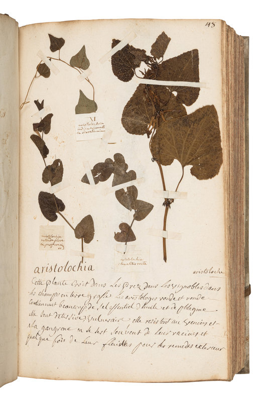 Including medicinal plant specimens organized alphabetically, frequently preserving stems, leaves and flowers (and occasionally root systems). Sebastien Jeanpierre was an apprentice to the apothecary M. Pierson. In France in the 18th century, individuals who wanted to become an apothecary had to obtain training directly from one. A fine example with many intact and well-preserved medicinal plants.