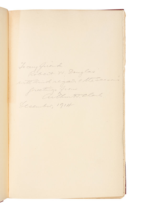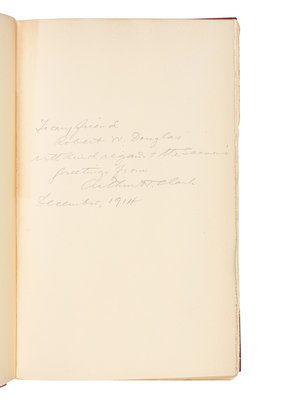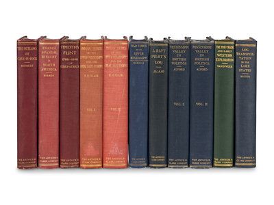 BLAIR, Emma Helen. The Indian Tribes of the Upper Mississippi Valley and Region of the Great Lakes. 1911. 2 volumes. Provenance: Robert W. Douglas (bookplates, inscription); Joseph M. Gleason (bookplates laid in). PRESENTATION COPY, INSCRIBED BY CLARK TO ROBERT W. DOUGLAS. -- MERRICK, George Byron. Old Times on the Upper Mississippi.1909. With a ticket for the Rock-Island Davenport Ferry Co., and the Eagle Packet Company, St. Louis ca 1900 laid in. -- KIRKPATRICK, John Ervin. Timothy Flint, Pioneer, Missionary, Author, Editor. 1911. -- ALVORD, Clarence Walworth. The Mississippi Valley in British Politics. 1917. 2 volumes. -- ROTHERT, Otto A. The Outlaws of Cave-in Rock. 1924. -- And 4 others. Together, 9 works in 11 volumes, all published by The Arthur H. Clark Company, in Cleveland, OH or Glendale, CA, all 8vo, all in original cloth gilt, FIRST EDITIONS, condition generally very good. Provenance for the lot: Dudley Bell Priester (1923-2017), Mississippi River collector and bibliographer (bookplates, sold Bloomsbury, 20 November 2009, lot 103). Complete list available on request.