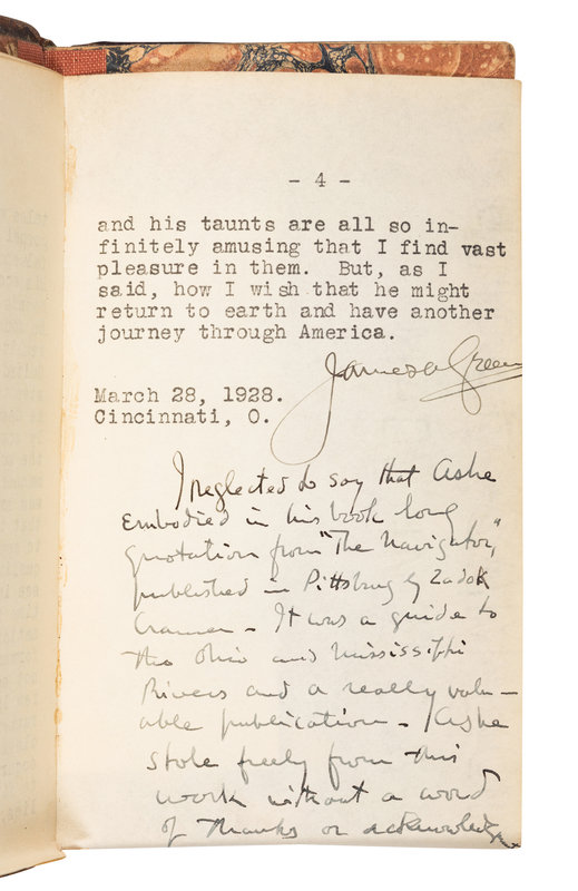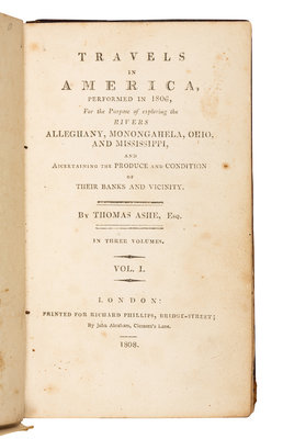 [Laid in:] GREEN, James Albert (1862-1955), author and collector of materials related to Ohio Valley History, and William Henry Harrison. Typed document with long postscript in manuscript signed ("James a Green"). Cincinnati, OH, 28 March 1928. 4 pages, 12mo, on wove paper bound with adhesive, some light toning and creasing. Regarding Ashe's hatred of Americans in Travels in America.