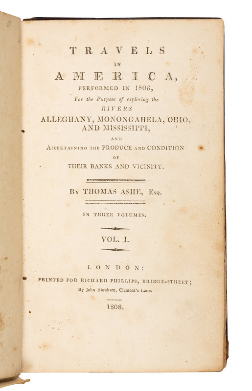 ASHE, Thomas (1770-1835). Travels in America, Performed in 1806, for the Purpose of exploring the Rivers Alleghany, Monongahela, Ohio, and Mississippi. London: Richard Phillips, 1808.