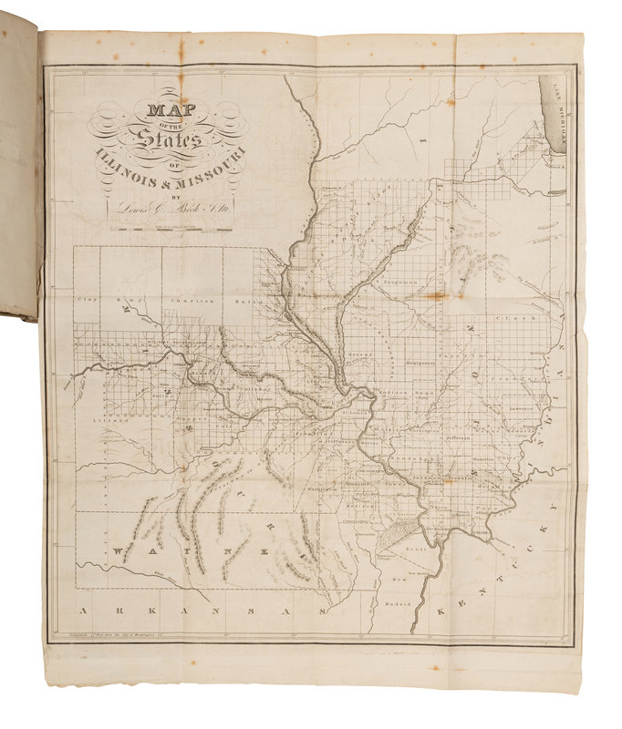 FIRST EDITION of one of the earliest books describing the Illinois settlement and present-day Missouri, "an important book. Beck gives the first full-length account of Illinois and Missouri, and the map, on the fairly large scale of 24 miles to the inch, is the first map of either state on such a large scale" (Streeter). The map depicts St. Louis as a rather large town, but Chicago, not yet sufficiently sized to justify a dot, is shown only by Ft. Dearborn and Chicago Creek. RARE: according to online records, only 4 copies of this work have appeared at auction in the last 40 years. Buck 180; Eberstadt 164-209; Graff 224; Howes B-297; Sabin 4231; Streeter Sale III: 1438.