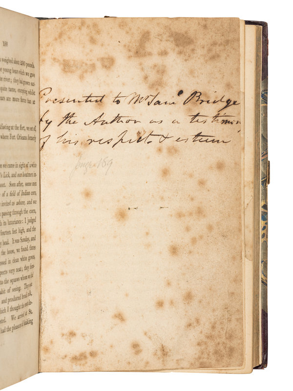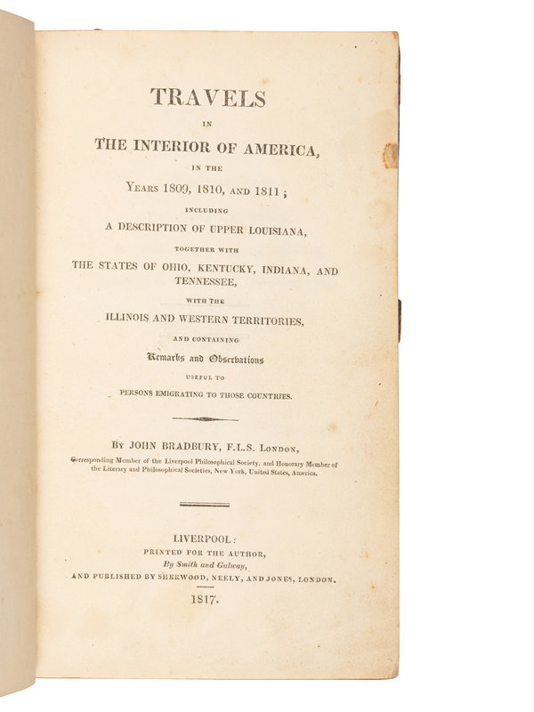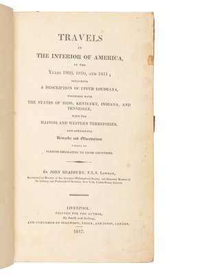 FIRST EDITION, PRESENTATION COPY, INSCRIBED BY BRADBURY to Bridge on a leaf tipped-in after p.188: "'Presented to Mr James Bridge by the Author as a testimony of his respect and esteem." Scottish naturalist Bradbury traveled with English botanist Thomas Nuttall to America. While traveling the Missouri River, they met Daniel Boone, then aged 84 and wearing nearly 60 beaver pelts. In addition to information about the Mississippi Valley, the appendix contains an Osage vocabulary, an account of John Colter's captivity, and a catalog of rare and valuable seeds for plants Bradbury discovered on the Missouri River near St. Louis. Travels in the Interior of America "deserves to be classed as one of the most accurate and pleasingly written travel accounts of this period of American history" (Clark). Buck 89; Clark Old South II:137(1); Graff 383; Howes B-695; Sabin 7207; Streeter Sale III: 1779; Wagner-Camp 14:1.