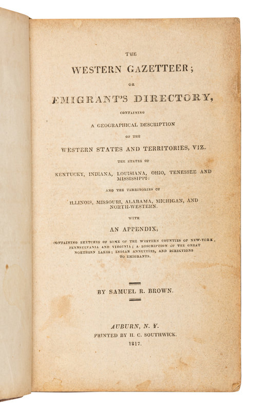 BROWN, Samuel R. (1775-1817). The Western Gazetteer; or Emigrant's Directory. Auburn, NY: Printed by H.C. Southwick, 1817.