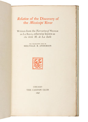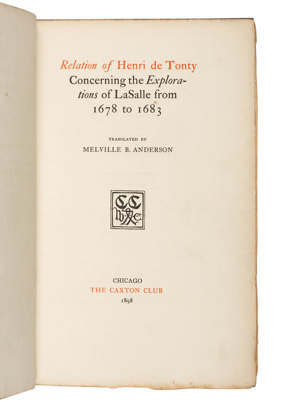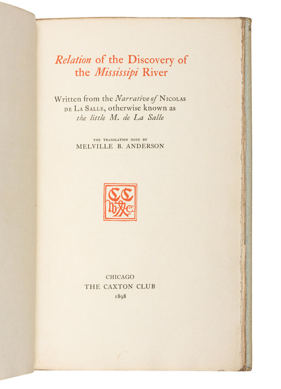 LA SALLE, Nicolas de. Relation of the Discovery of the Mississippi River. 1898. One of 266 copies. -- TONTY, Henri de. Relation of Henri de Tonty Concerning the Explorations of La Salle from 1678 to 1683. 1898. Provenance: Edward Everett Ayer (1841-1927) American business magnate and Americana book collector (laid in shelfmark & presentation bookplate to the Newberry Library, 1911); Newberry Library (deaccession label and presentation bookplate from Ayer). One of 194 copies. -- STEVENS, Frank Everett. Wakefield's History of the Black Hawk War. 1908. One of 200 copies. -- Together, 3 works in 3 volumes, all published in Chicago by the Caxton Club, all 8vo, all printed on hand-made paper, all in original vellum-backed boards with spines gilt-lettered and uncut, ALL LIMITED EDITION, condition generally very good. Provenance: all from the collection of Dudley Bell Priester (1923-2017), Mississippi River collector and bibliographer (laid in receipt, sold Bloomsbury, 20 November 2009, lot 67).